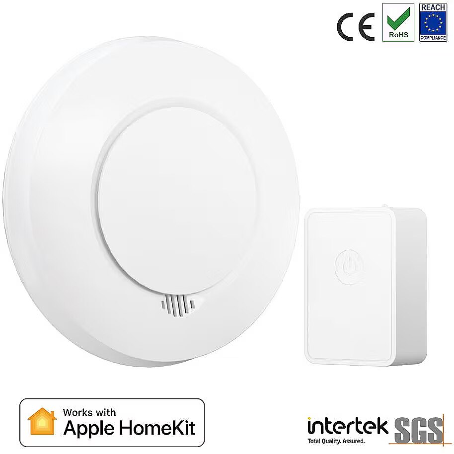 Description - Smart Smoke Alarm Kit GS559AH •Safe and Reliable: Comply with CE EN14604 (Certified by Intertek). Alarm at maximum 85dB. •Alarm Linkage: When one alarm detects smoke, all alarms will chirp to remind you. (Purchase multiple smoke alarms.) •Alert: Your Meross app or Apple Home app will receive an alert instantly when danger happens. •Battery Replaceable: 2 x 1.5V AA batteries included and replaceable. •Automation: Set triggers to control other Meross devices in the Meross app. •Smoke and Overheat Detection: In addition to smoke detection, it can also detect overheating. When the temperature is too high (54 - 70℃), it will chirp to remind you. •Control Up to 16 Devices: One hub is able to control 16 meross devices (sensors, detectors, thermostat valves) at same time. •Works with Apple HomeKit and is compatible with SmartThings.