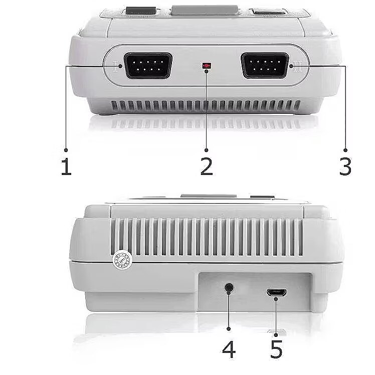 Ikviens atradīs spēli sev Pateicoties atbalstīto spēļu daudzveidībai, sfc mini konsole ir ideāla dāvana gan bērnam, gan cilvēkam kurš atceras 8 bitu datorspēļu ziedu laikus. Konsolē ir 620 instalētas retro spēles- Super Mario Contra Arkanoid Pacman Robocop Donkey Kong Mortal Kombat Bomber Man Popeye Turtles Tetris Chip & Dale F1, futbols, teniss, beisbols un daudz kas cits! Konsoles savienotāji: Spēļu paneļa savienotājs #1 Konsoles darbības statusa indikators Spēļu paneļa savienotājs #2 AV-Out savienotājs Mikro-USB ports Komplektā ietilpst: Sfc mini konsole 2 vadu kursorsviras AV-OUT kabelis televizoram (komponents) Maiņstrāvas adapteris ar mikro-USB savienotāju konsoles uzlādēšanai Lietotāja rokasgrāmata ar pilnu spēļu sarakstu