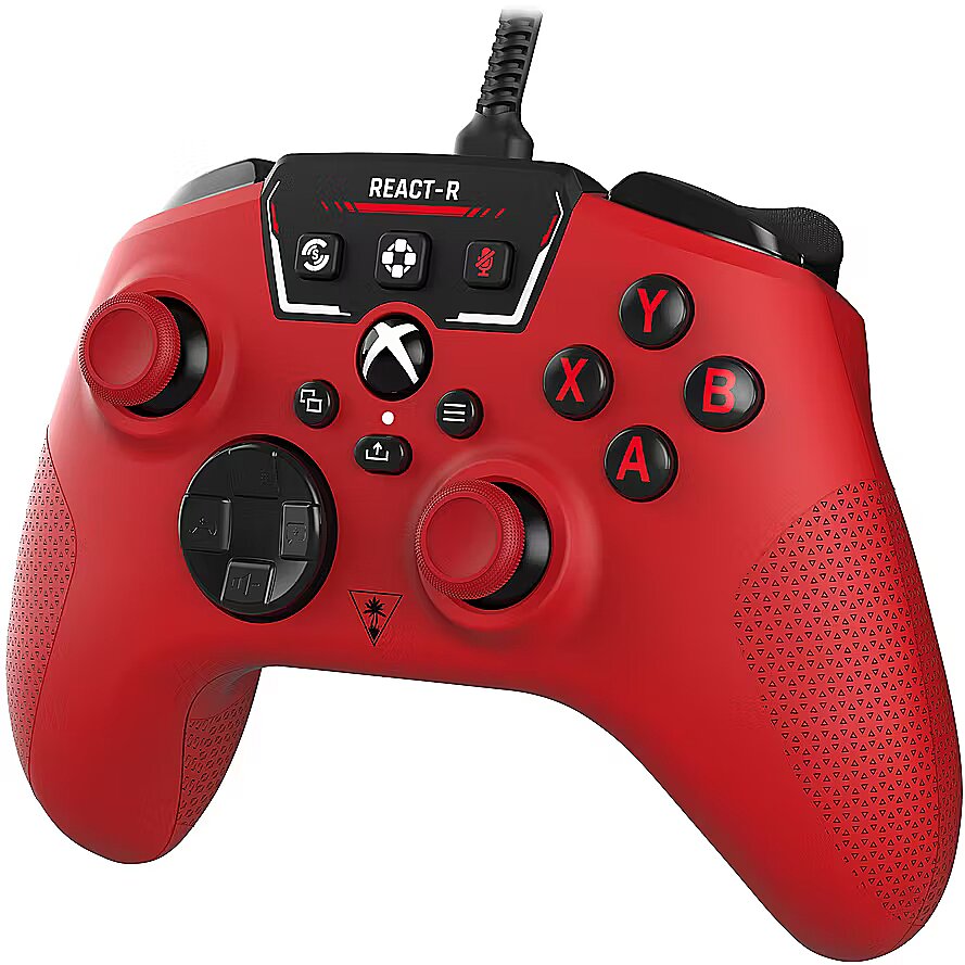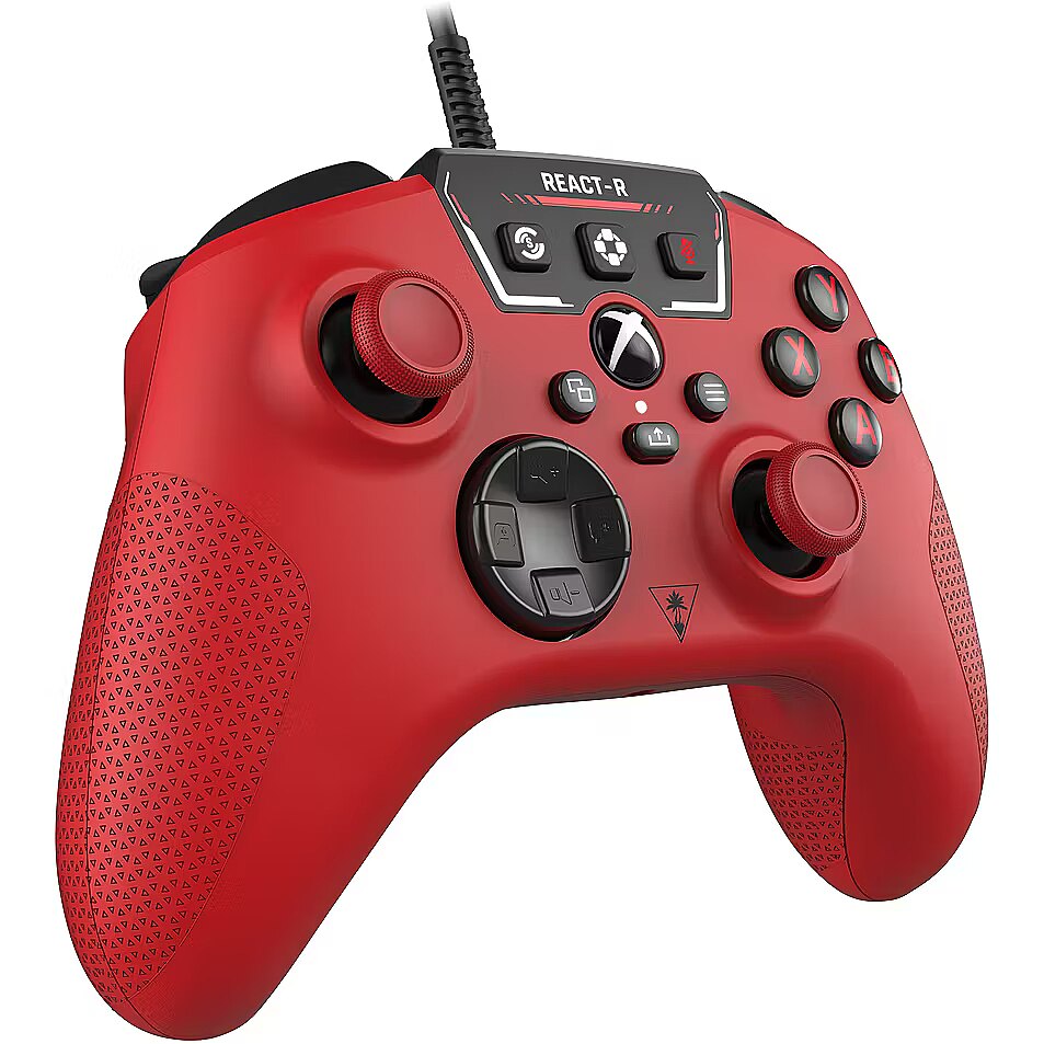 LongSummaryDescription - Turtle Beach React-R. Device type: Gamepad, Gaming platforms supported: PC, Xbox One, Xbox Series S, Xbox Series X, Gaming control function buttons: D-pad, Menu button, Share button, View button. Connectivity technology: Wired, Device interface: USB, USB connector type: USB Type-A, USB Type-C. Product colour: Red, Cable length: 2.5 m. Power source: Cable. Width: 155 mm, Depth: 110 mm, Height: 63 mm