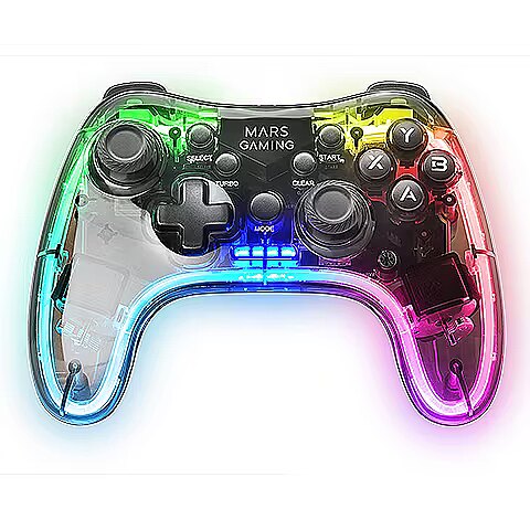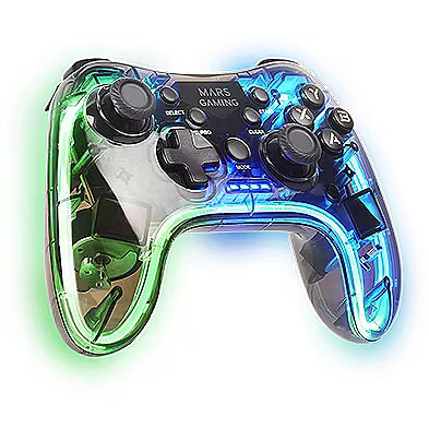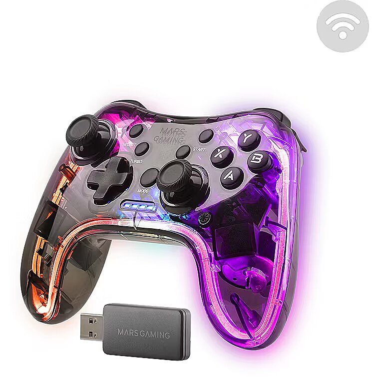 LongDesc - Professional 2.4GPRO wireless gamepad, lag-free and with maximum connection stability. Spectacular translucent black design with NEON RGB lighting. Dual haptic vibration system and superior multi-platform compatibility.PROFESSIONAL 2.4GPRO WIRELESS CONNECTIONFor professional wireless performance without lag or interference, the MGP-24 features the most advanced 2.4GPRO technology with a built-in USB adapter. The 2.4GPRO connection is the professional wireless technology of choice as it is technically superior, faster and more stable than Bluetooth technology. Plus, enjoy up to 10 hours of use with its high-capacity battery and conveniently recharge it with the included detachable USB-C cable.RGB NEON TRANSLUCENT DESIGNAdmire the electronic and mechanical beauty of the MGP-24 through its translucent black finish and be dazzled by its spectacular multi-mode RGB fiber optic lighting system.RGB multi-mode lightingDUAL HAPTIC VIBRATIONThe MGP-24 features a powerful haptic vibration system to bring extreme realism to your gameplays.ERGONOMIC DESIGNComfort is guaranteed thanks to its ergonomic design with rounded shapes and asymmetrically positioned joysticks.SUPERIOR MULTI-PLATFORM COMPATIBILITYCompatible with PC, PS3, PS4, PS5 (PS4 games only), XBOX360, Raspberry Pi, Mac and *Android MAXIMUM PERFORMANCEX-input and Direct-input modes for full compatibility, turbo function, 20 touch buttons, analog joysticks and high-precision directional pad.