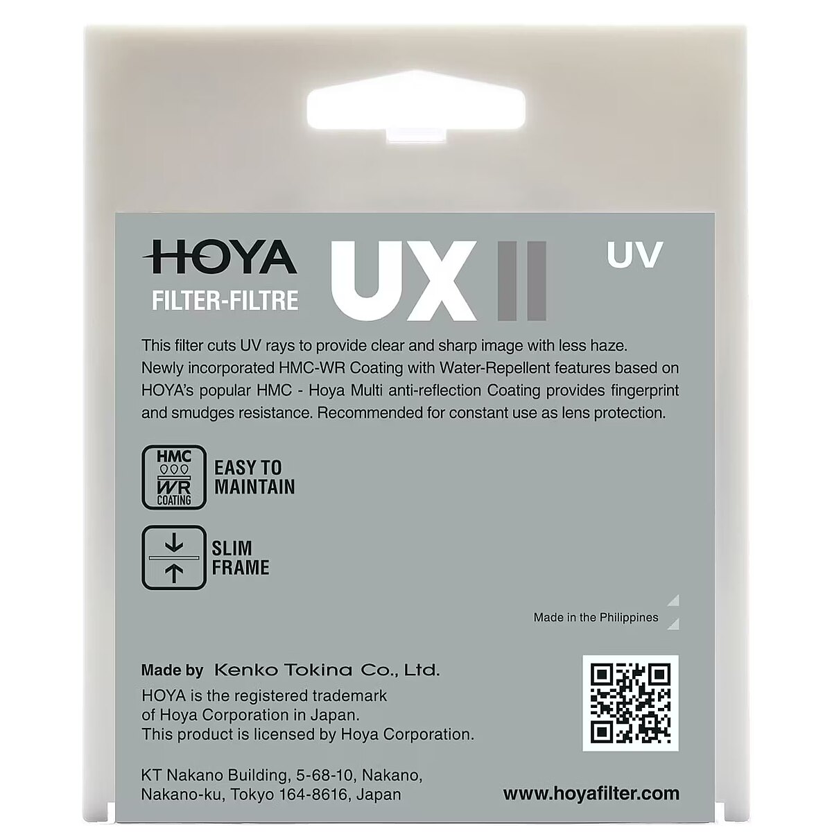 description_et - Hoya UX II sērijas UV filtrs izmanto daudzslāņu, ūdeni atgrūdošu izkropļojošu stiklu. Filtrs rada minimālu atstarojumu, tādējādi ievērojami samazinot ēnojumu un iekšējos atstarojumus. UX II UV filtram ir plāns alumīnija rāmītis - tas ir ideāli piemērots lietošanai ar platleņķa objektīviem, jo nerada vinjetēšanu rāmja malās. Kāpēc UV filtrs? UV filtrs ir būtisks fototehnikas palīgs. Tas novērš UV staru nokļūšanu uz sensora un ir ideāli piemērots kā ikdienas objektīvu aizsardzības filtrs. Filtrs efektīvi aizsargā objektīvu no putekļiem, mitruma un skrāpējumiem. Tā kā UV filtrs neietekmē kontrastu vai krāsu līdzsvaru, to var kombinēt ar citiem filtriem. Ultravioletais starojums ir acīm neredzams, tomēr tas var ietekmēt attēla kvalitāti, jo īpaši situācijās, kad UV starojums ir bagātīgāks (kalnos ar tīru gaisu, piekrastes teritorijās pavasarī, teritorijās, kur ir mazāk ozona). Rezultāts ir spēcīgāks zilais tonis un attēli ar mazāku asumu.