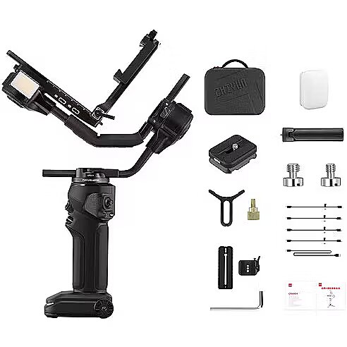 The four 18650 batteries support up to 12 hours of operation time and can be fully charged in less than two hours thanks to USB Power Delivery fast charging. Set includes Zhiyun Crane 4 stabilizer Table tripod (WB2) Carrying case Camera backing base Lens support Double-layer quick release plate Reflector 3/8" screw 3 × 1/4" screw 1/4" wrench Sony USB-C - Multi USB control cable 2 × Canon control cable Panasonic control cable USB-C cable Quick start guide