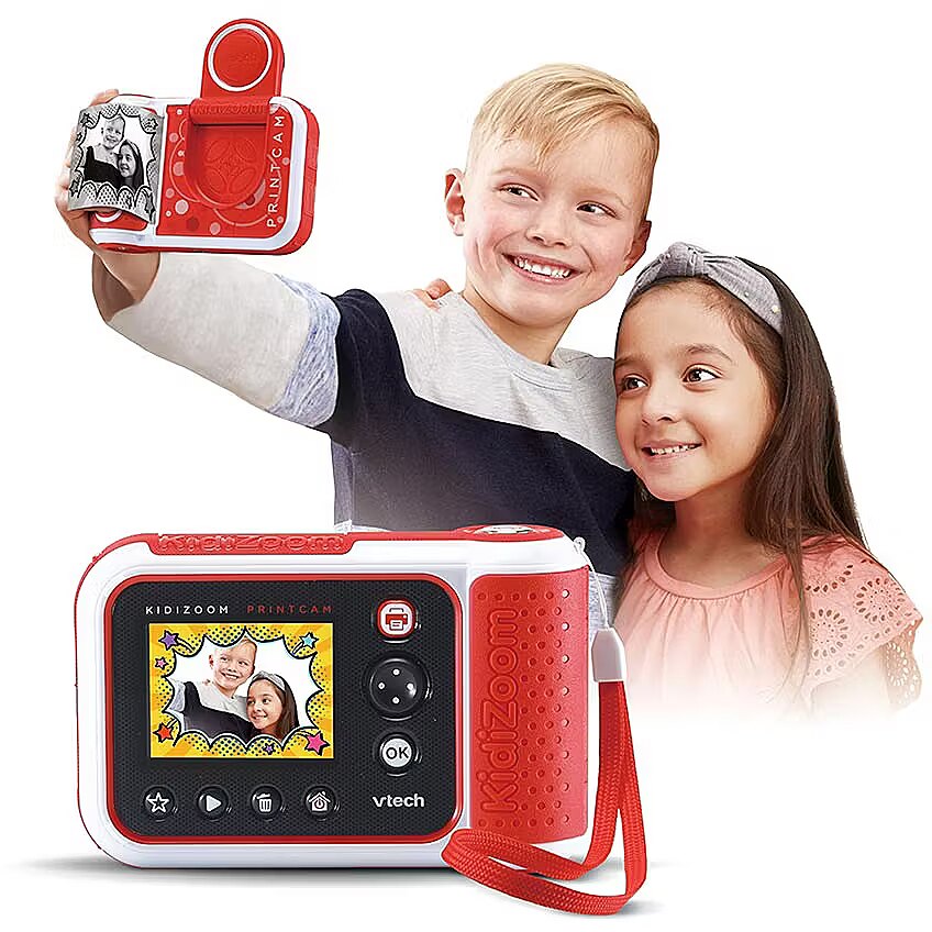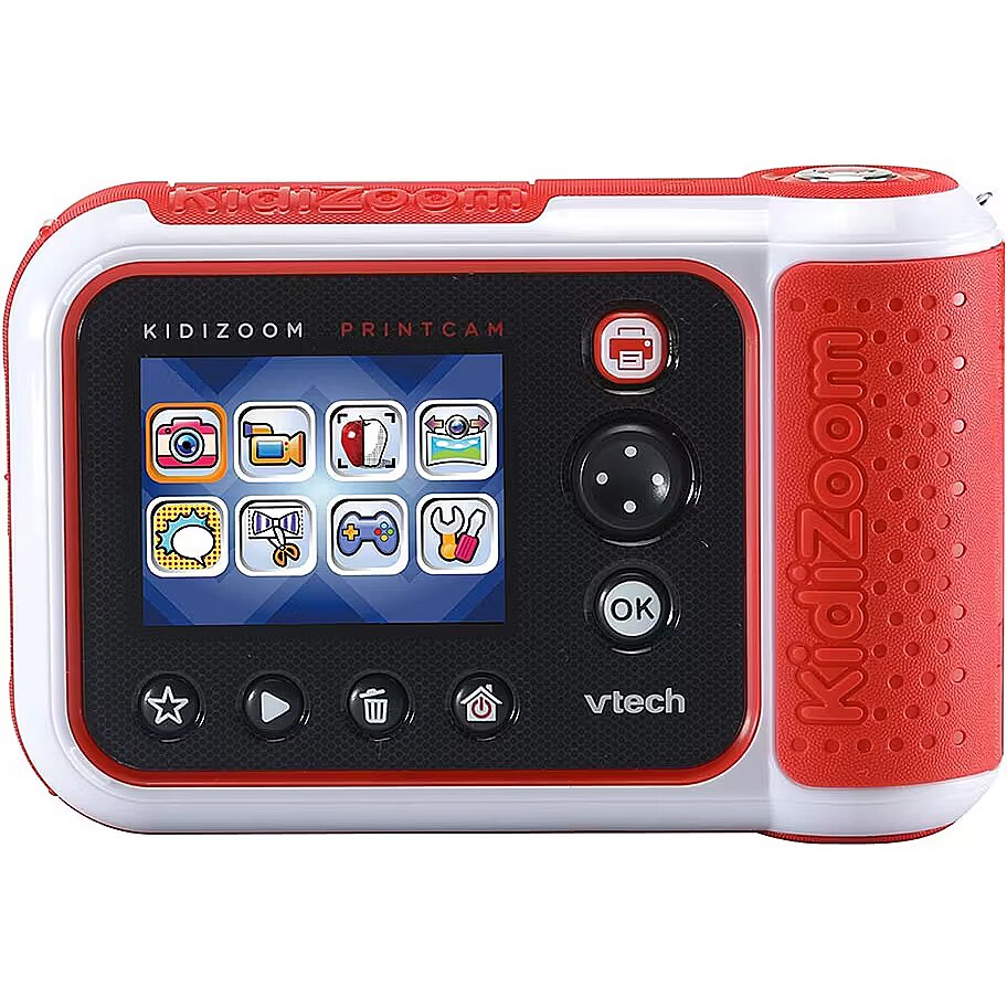 Technical_details - KidiZoom Print Cam, digital camera The VTech KidiZoom Print Cam is a robust children's camera with a built-in thermal printer. In addition, it is also a photo and video camera with selfie function and face recognition. It has child-friendly controls and a 6.1 cm (2.4") display. Photos, games, comics, maps and much more can be printed out with it in no time at all. Thanks to the child-friendly photo and video editing, pictures and videos can also be printed can be provided with cool effects, frames and stamps. Photos that have been taken can easily be transformed into coloring pictures and printed out. With the innumerable printing templates for games, play money, accessories, etc., children can let their creativity run free! Type: digital camera Colour: red/white EAN: 3417765491849 Manufacturer number: 80-549184 Camera type: digital camera for kids Sensor: Number of image sensors | 1 Sensor: Sensor resolution | 2 megapixels zoom: digital | 4 times Max video resolution: 640x360 pixels Video resolutions: 320x180, 640x360 Display available: Yes Display size: 6.1 cm (2.4 ") Storage: Internal Storage | 256MB Connections: 1x USB Built-in Microphone: Yes Power supply: built-in rechargeable battery Note: Recommended age: 4 - 12 years; Warnings: Not suitable for children under 36 months! Caution: Danger of suffocation due to small parts that can be swallowed! Feature: Built-in thermal printer, selfie function (foldable lens), child-friendly photo and video editing with over 40 effects, transform your own photos into coloring pages, 3 games, automatic switch-off, child-proof battery compartment, face recognition, panorama function Further information: Over 110 templates (cards, games, coloring pictures, play money, etc.), numerous stamps and frames for photos and videos Accessories: available | USB cable Dimensions: Width: 134mm x Height: 92mm x Depth/Length: 48mm Weight: 370 grams