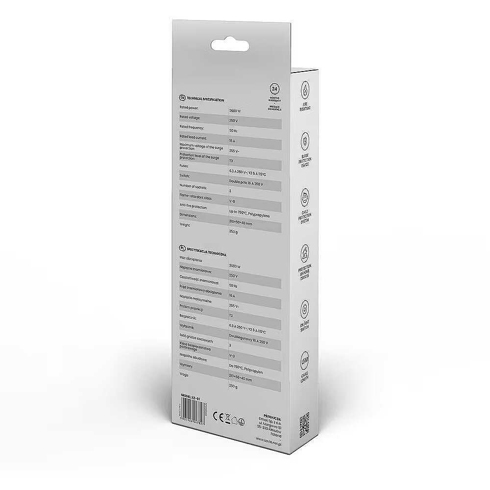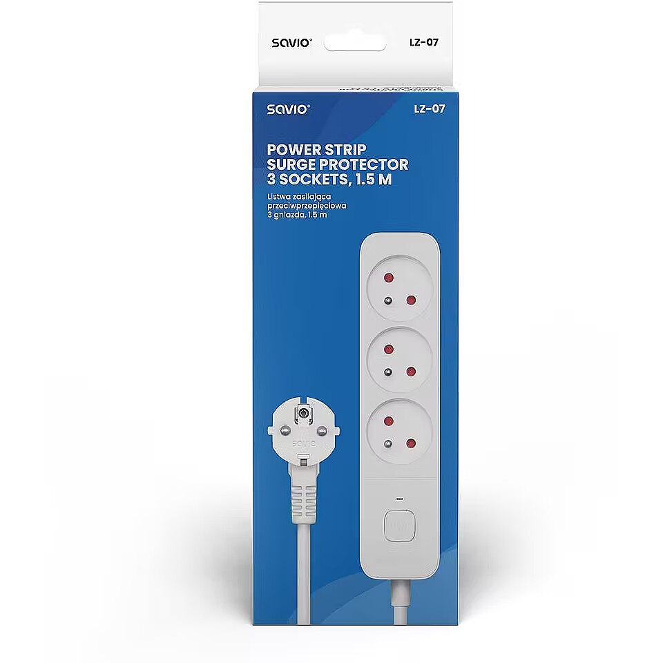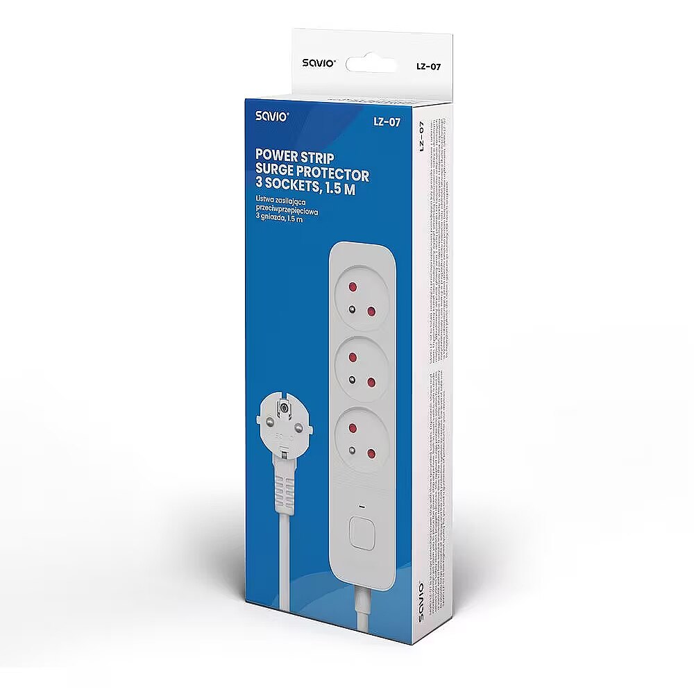 Description - On/off switch You will find a built-in illuminated on/off switch so you can disconnect the power yourself. You don't have to unplug the entire strip from the socket. After pressing the button, you cut the power from the connected appliances. Fire-resistant The housing is made of Polypropylene characterised by high chemical and electrical resistance. This material is lightweight, shock-resistant, odourless and, in addition, non-flammable. LZ-07 is a high-tech design that provides a complete level of protection for you and your devices. Surge protection The power strip features even more effective protection of the connected device against the negative effects of electrical impulses coming from the mains (caused, for example, by lightning). The LZ-07 is equipped with surge protection based on a varistor and a fuse to ensure immediate response time. The surge protection strip effectively protects against the propagation of surges in devices plugged into its sockets. Child protection Thanks to special plugs in the sockets of the skirting board, you do not have to worry about the safety of your child, who, tempted by the desire to discover the world around them, will meticulously examine each subsequent socket of the device when the opportunity arises. Protecting your home appliances Ensure that your valuable electrical appliances are effectively protected against surges. Thanks to the power strip, you can rest easy without worrying about the most valuable electronic equipment you own at home or in the office. Cable length 1.5m The 1.5 metre long cable will allow you to place the power strip in the most necessary places in your home or office. The optimum length of the cable fits perfectly into the characteristics of ergonomics and modern design.