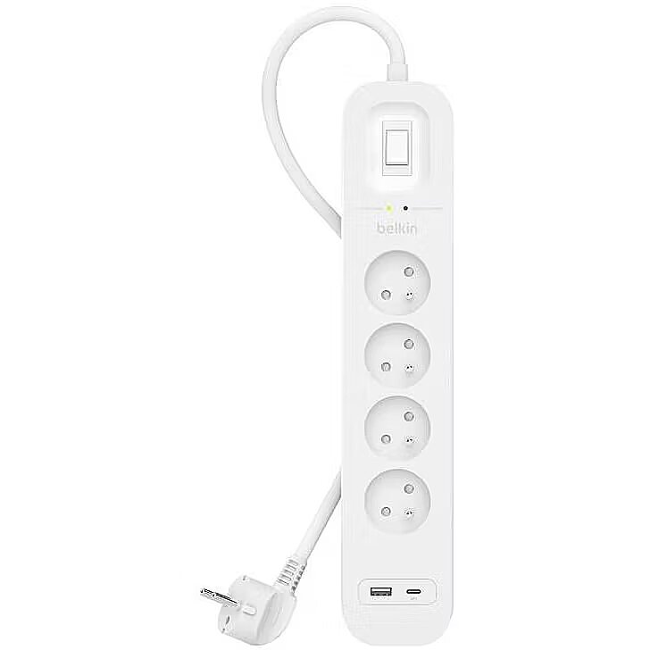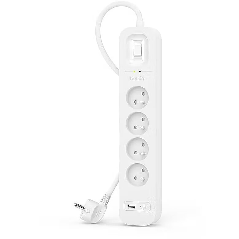 Description - Surge protection with USB-C and USB-A ports (4 ports, 1 USB-A port and 1 USB-C port) Extend the life of your electronics and equipment with 525J surge protector, featuring four AC outlets, USB-C PD and USB-A ports Benefits of using the product 525 J of surge protection Fast charging via USB-C PD USB-C and USB-A ports USB-C charging with a maximum power of 18 W Extends the durability of electronic devices More intelligent and safe design 2 m power cord Mounting holes on the back allow for easy installation to save space on floors and countertops Protection indicators let you know that devices are safe Compatible with AC outlets, USB-C PD ports, USB-A ports 2-year warranty Belkin SurgePlus product family SurgePlus protects connected devices against damage resulting from voltage fluctuations and overvoltages caused by, among others, by lightning or power failures. Surge protection helps you avoid costly repairs and the loss of valuable data in the event of a power surge, and extends the life of your devices by blocking smaller fluctuations for a longer period of time. Connected equipment insurance provides additional protection and peace of mind.