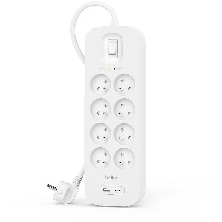 Description - Surge protection with USB-C and USB-A ports (8 ports, 1 USB-C port and 1 USB-A port) Extend the life of your electronics and equipment with 900J surge protection, featuring eight AC outlets, USB-C PD and USB-A ports Benefits of using the product: 900 J of surge protection Fast charging via USB-C PD USB-C and USB-A ports Extends the durability of electronic devices More intelligent and safe design 2 m power cord Mounting holes on the back allow for easy installation to save space on floors and countertops Protection indicators let you know that devices are safe Compatible with AC outlets, USB-C PD ports, USB-A ports 2-year warranty Belkin SurgePlus product family SurgePlus protects connected devices against damage resulting from voltage fluctuations and overvoltages caused by, among others, by lightning or power failures. Surge protection helps you avoid costly repairs and the loss of valuable data in the event of a power surge, and extends the life of your devices by blocking smaller fluctuations for a longer period of time. Connected equipment insurance provides additional protection and peace of mind. Features of the Belkin SurgePlus product family Three-way protection (phase, neutral, ground) Multiple secured sockets The Belkin Difference approach A pioneer in innovation and technology for 40 years The #1 third-party manufacturer of wireless charging accessories