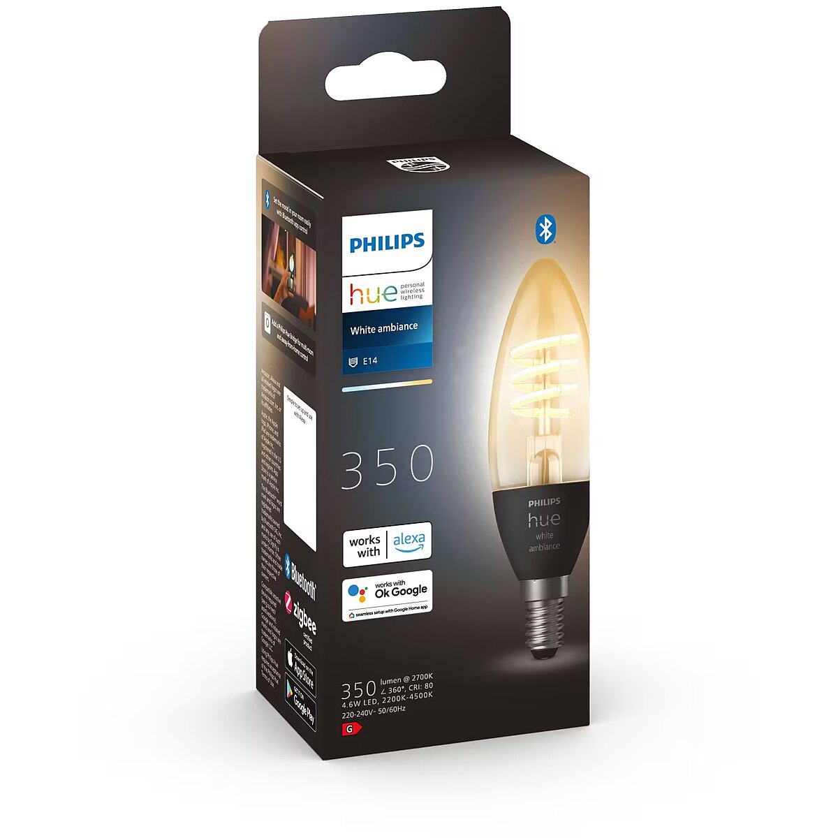 LongDesc - Easy smart lightingGet the classic look of a vintage bulb in a smaller size. The Filament candle bulb has a coiled inner lament and E14 base, perfect for bringing warm-to-cool white light to small xtureswhere you want vintage style with a modern twist.Easy smart lighting- Control lights with your voice- Control lights with your voice- Unlock full suite of smart light features with Hue Bridge- Set the right mood with warm-to-cool white light