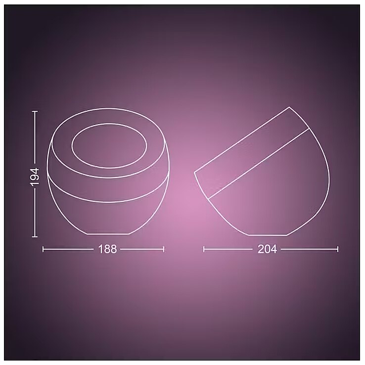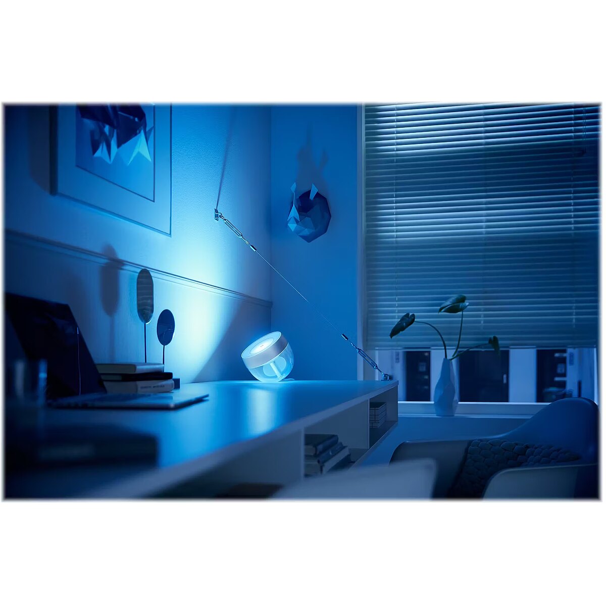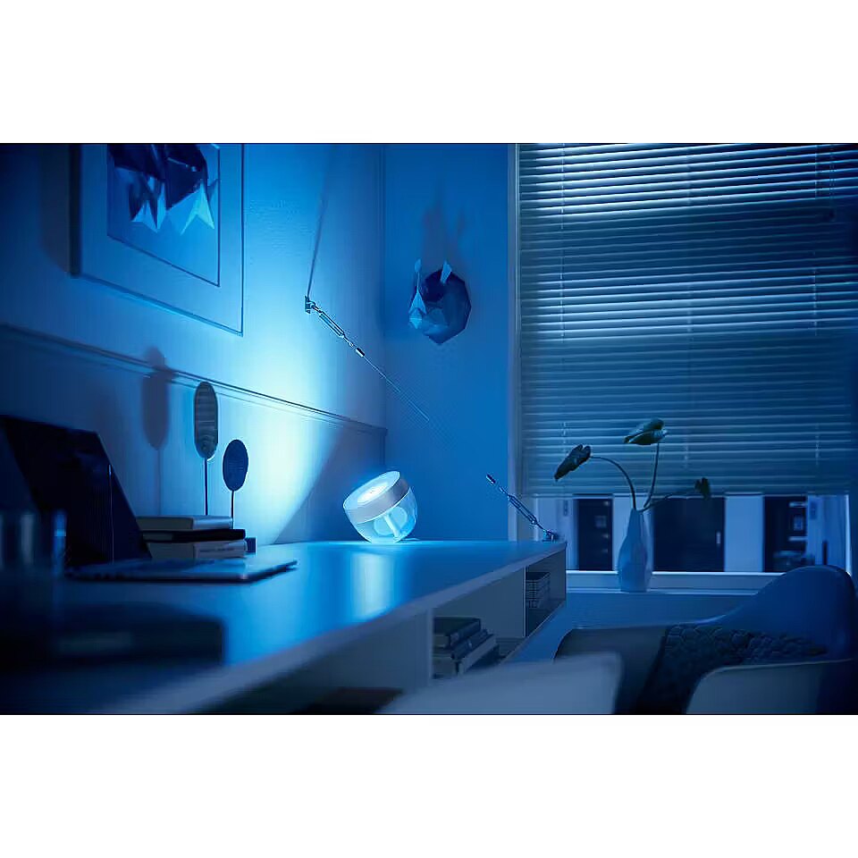 LongSummaryDescription - Philips Hue White and colour ambience Iris silver special edition. Type: Smart table lamp, Interface: Bluetooth/Zigbee, Product colour: Silver. Mobile operating systems supported: Android 10.0, iOS 15. Energy efficiency class: G, Energy consumption per 1000 hours: 8.1 kWh, Input voltage: Напруга 100 В – 240 В. Cable length: 2 m, Width: 188 mm, Depth: 204 mm. Package type: Box, Package width: 230 mm, Package depth: 230 mm