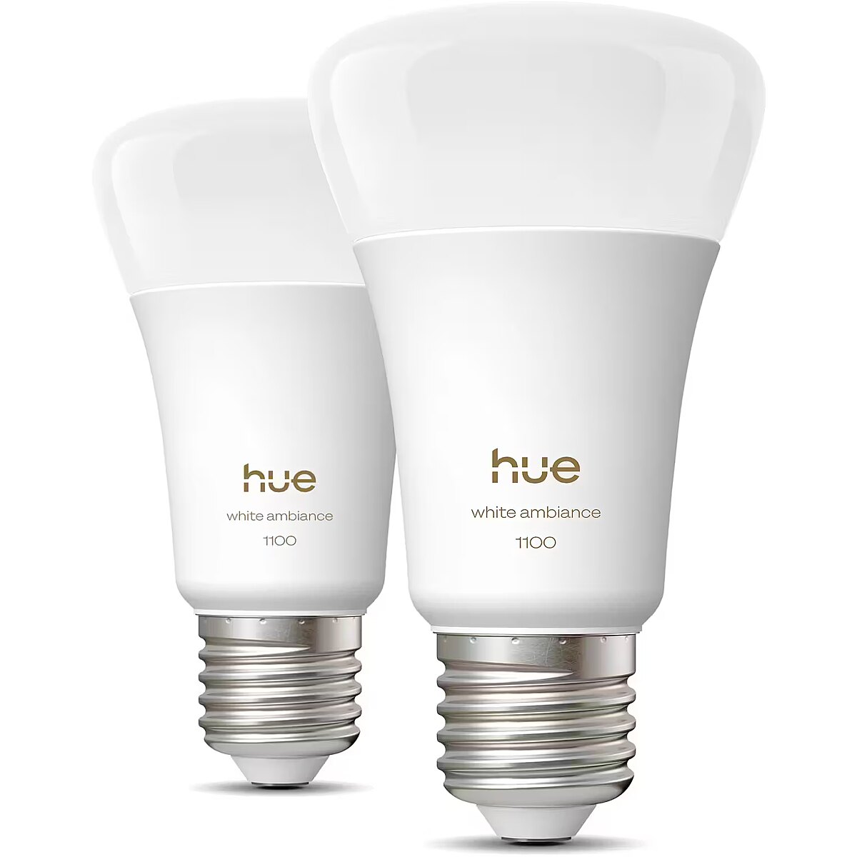 LongSummaryDescription - Philips Hue White ambience A60 – E27 smart bulb – 1100. Type: Smart bulb, Interface: Bluetooth/Zigbee, Product colour: White. Energy efficiency class: D, Power consumption (typical): 8.1 W, Power consumption (standby): 0.1 W. Width: 60 mm, Height: 112 mm, Weight: 190 g. Package type: Box, Package width: 146 mm, Package depth: 72 mm. Quantity per pack: 2 pc(s), Number of hue bulb(s) included: 2 bulb(s)