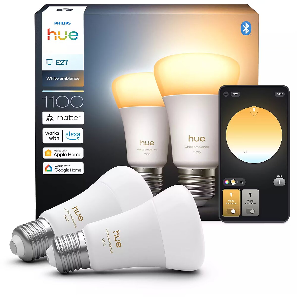 LongDescription EN - Bring natural daylight into your homeThe Philips Hue White Ambiance A60 E27 delivers full-spectrum white light designed to support your daily routine. From warm candlelight tones to crisp, energising white light, one bulb adapts to every moment of the day. Wide colour temperature rangeWith adjustable white light from 1,000 to 20,000 K, you can tailor your lighting for productivity, relaxation, or gentle night lighting. Ultra-low dimming for perfect ambienceDimming down to just 0.2% brightness allows you to create soft, subtle lighting that’s ideal for evenings and nighttime use. Easy control via app or voiceUsing the Philips Hue Bluetooth app, you can control up to 10 lights in a single room. The bulb also supports voice control through assistants such as Google Assistant and Amazon Alexa. Unlock full smart lighting with Hue BridgeAdd a Hue Bridge to access advanced features like remote control, automations, schedules, and whole-home smart lighting experiences.