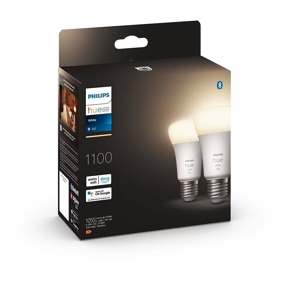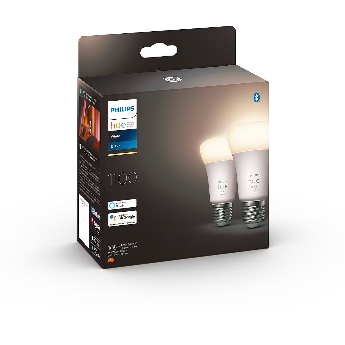 LongSummaryDescription - Philips Hue White A60 – E27 smart bulb – 1100 (2-pack). Type: Smart bulb, Interface: Bluetooth, Product colour: White. Mobile operating systems supported: Android 10.0, Android 11.0, Android 12.0, iOS 14, iOS 14.5, iOS 15. Energy efficiency class: F, Energy consumption per 1000 hours: 10 kWh, Power source type: AC. Width: 61 mm, Depth: 61 mm, Height: 110 mm. Package type: Box, Package width: 148 mm, Package depth: 78 mm