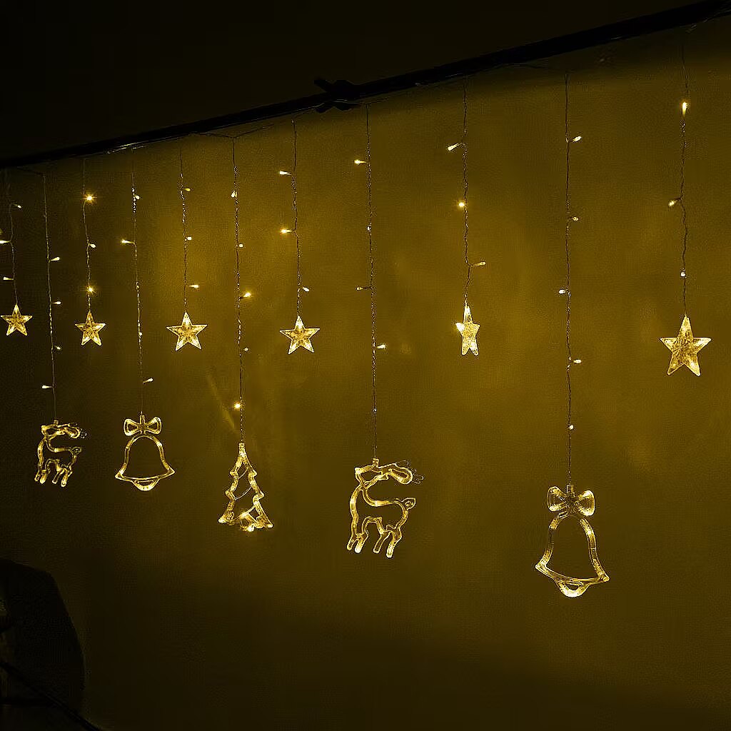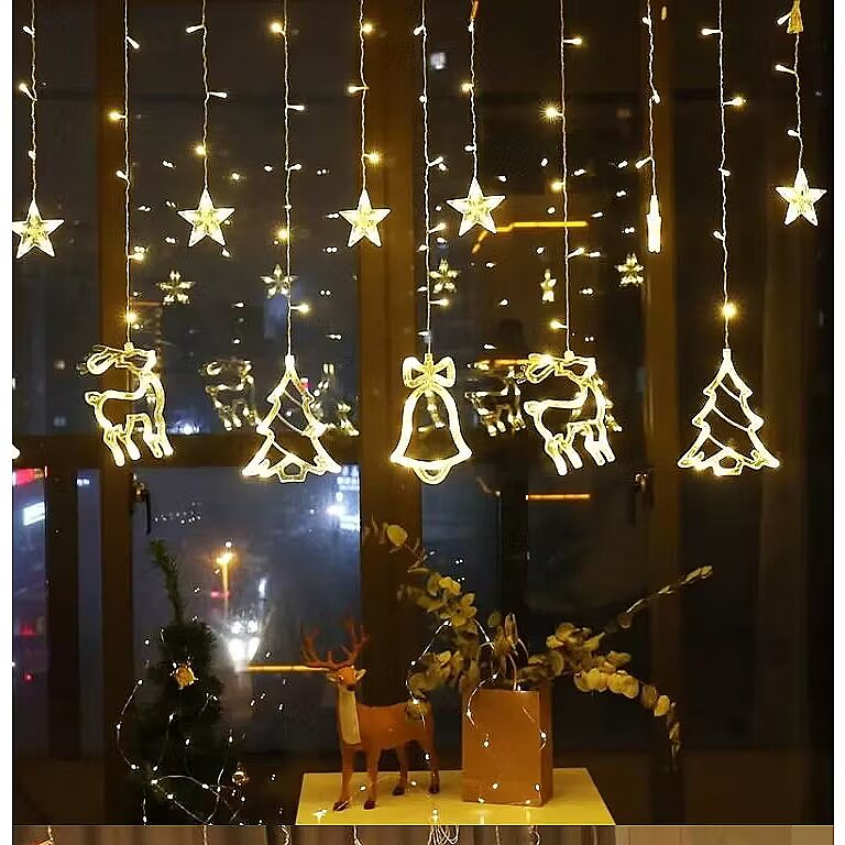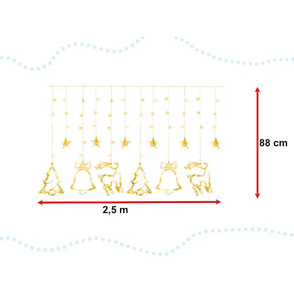 PARAMETRI: Krāsa: silti balta Sekciju skaits: 8 Lampas barošana: no tīkla Zvaigžņu skaits: 6 gab Zvanu skaits: 2 gab Ziemeļbriežu skaits: 2 gab Ziemassvētku eglīšu skaits: 2 gab Lampu skaits: 138LED Attālums starp lāstekām: 23 cm Aizkaru garums bez strāvas kabeļa: 2,5 m Aizkaru augstums garākajā vietā: 88 cm Aizkaru augstums īsākā vietā: 50 cm Strāvas kabeļa garums: 3 m Iepakojuma izmēri: 20cm x 13cm x 20cm