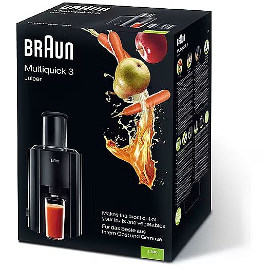 LongDesc - The Braun Multiquick 3 juicer J300Made out of high gloss plastic body with stainless steel accents, the Braun Multiquick 3 Juicer J300 is a robust yet elegant and compact appliance. Every line, every detail has been thought through carefully to combine form and function, beauty and performance.Makes the most out of your fruits and vegetablesThe spout, drip stopper, pulp container and ‘pusher’ integrate themselves perfectly in the overall design creating a seamless unity.And as Braun is about both form and function, going beyond just design every part has been created with end performance in mind.