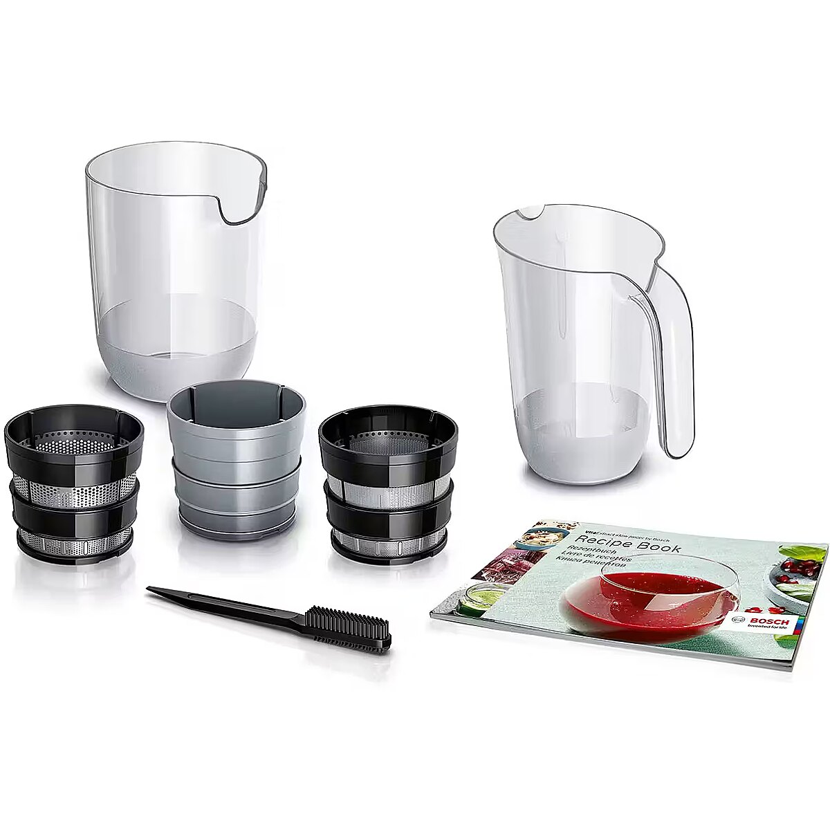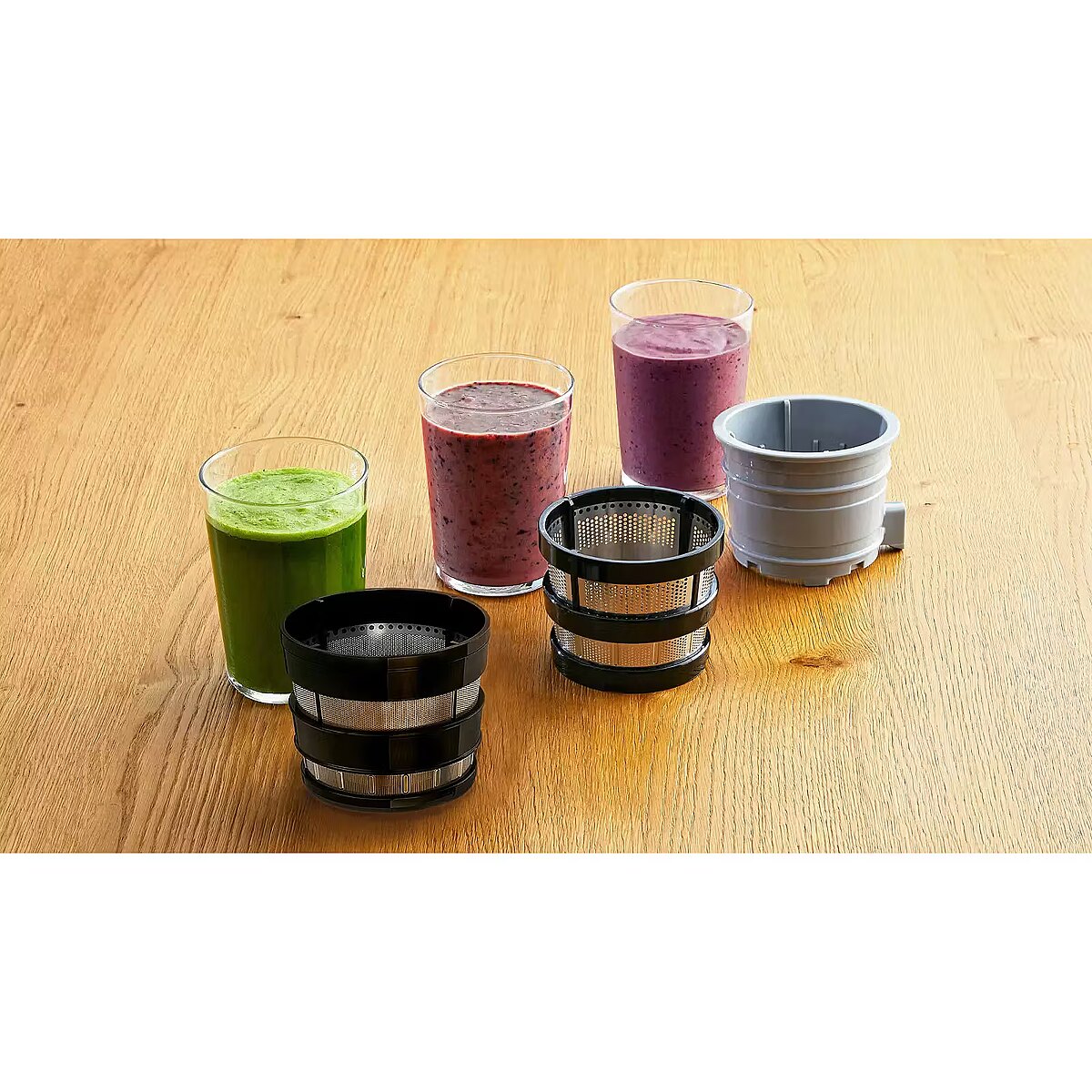 • Accessories included: juice container 1000 ml, pulp container 1300 ml, 3 filters: fine filter with fine holes, coarse filter with large holes, sorbet filter