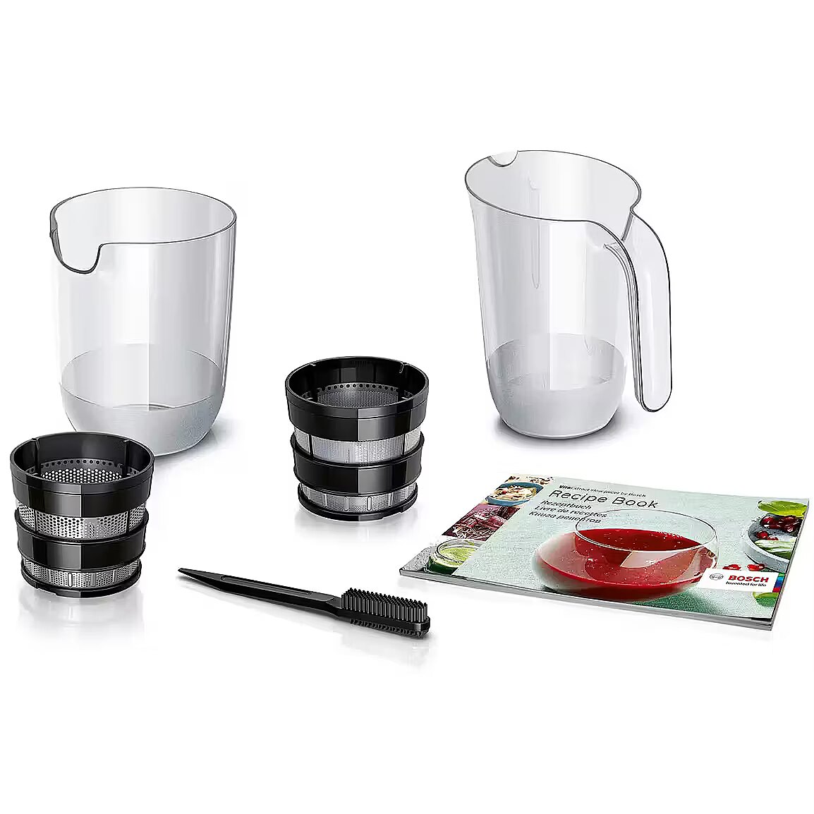 LongSummaryDescription - Bosch MESM500W. Product type: Slow juicer, Product colour: Black, White, Juice container capacity: 1 L. Housing material: Plastic, Filter material: Stainless steel. Power: 150 W. Width: 152 mm, Depth: 152 mm, Height: 427 mm