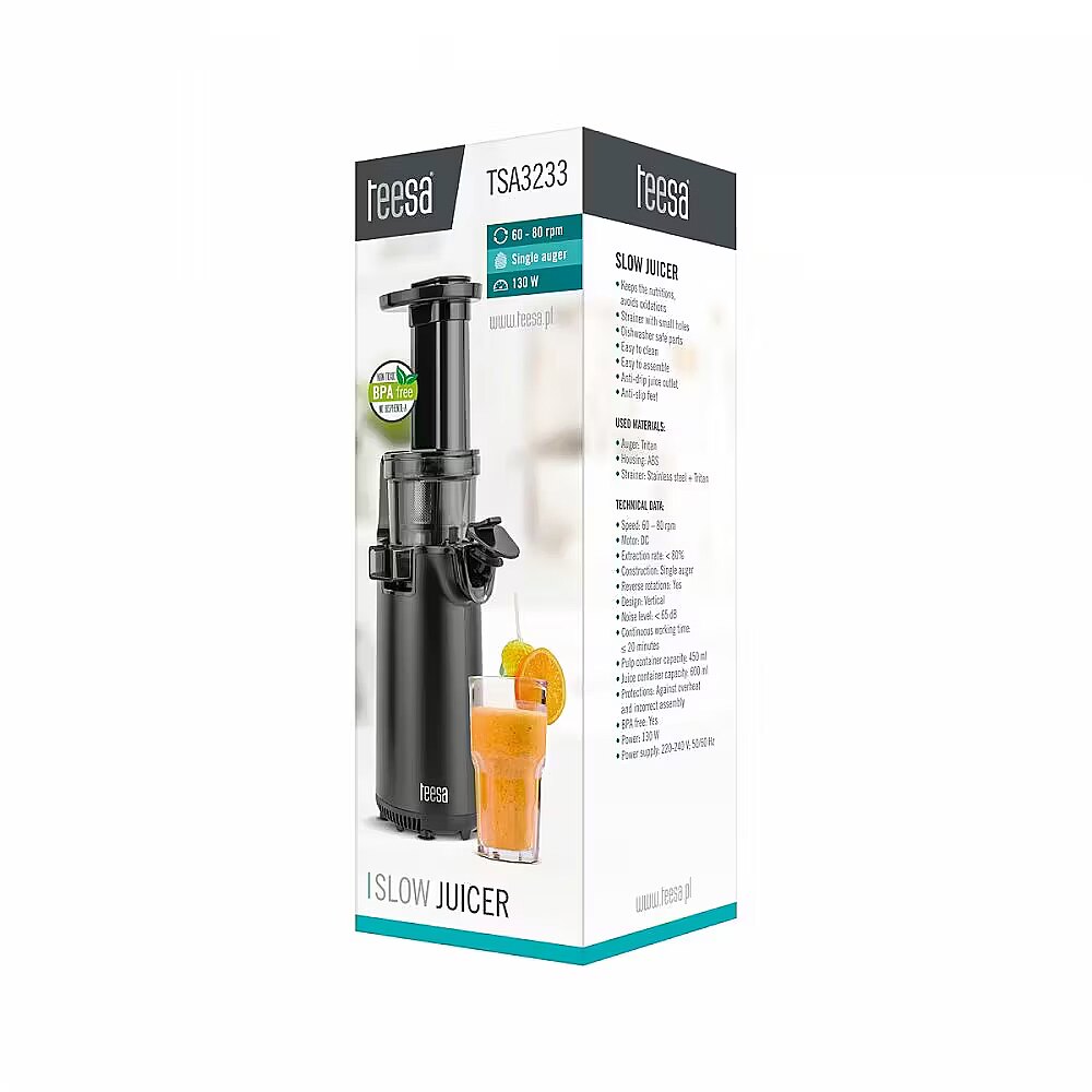 Description - Teesa slow-running juicer TSA3233 Slow-rotating fruit and vegetable juicers are appreciated by mums who care about the health of their children, as well as by those leading a healthy and active lifestyle. If you are wondering whether it is worth buying a slow-rotating juicer, check out the Teesa TSA3233. The juice it presses is less oxygenated and contains a great deal of nutritional value. Importantly, the materials used in the production do not contain bisphenol, which is particularly important for the health benefits of the pressed juice. High performance Don't let the small size of the TSA3233 juicer fool you. It has 130 watts of power, driving the single-scroll system at a maximum speed of 80 rpm. This combination guarantees high performance, ensuring that you always squeeze the maximum amount of juice from both soft and hard fruit. Easy to clean The small size of the TSA3233 slow juicer is very easy to assemble. This makes making juices extremely convenient. The convenience of use is also enhanced by the fact that selected components can be washed in the dishwasher. A brush is also included for easy cleaning under running water. Drip lock The TSA3233 slow-running fruit and vegetable juicer has an anti-drip lock to ensure the pressed juice stays in the bowl. This allows you to mix juice from several types of fruit and vegetables and pour it directly into glasses. Variety of accessories When you choose a Teesa slow juicer, you also receive a set of accessories that are essential for comfortable operation. In addition to the cleaning brush and pusher, you will also find two containers. One for the superfluous pulp and another, equipped with a litre scale, for the juice. Compact slow-running juicer Which slow-rotary juicer will be best for a single or small family? It will certainly be the compact TSA3233 model, which provides maximum performance while taking up very little space in the cupboard, and its design blends perfectly into contemporary interiors.