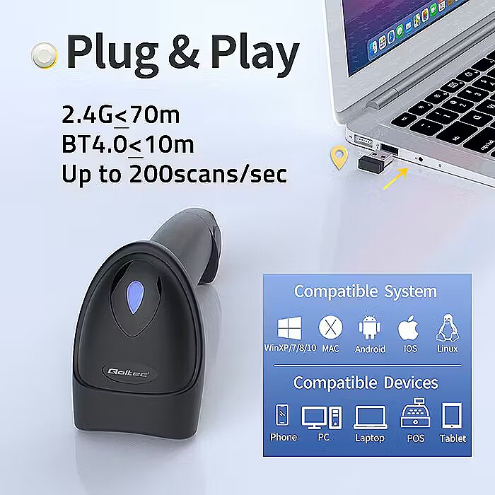 With devices such as the barcode reader from Qoltec, the work of even the largest warehouses or logistics points is quick and easy. Readers are used in shops, pharmacies, logistics points, airports, libraries, offices, offices, gyms and many other places you visit every day. Our reader will work perfectly in any of these places. The device guarantees: the reading of 1D and 2D codes, efficient operation with a speed of 200 scans per second, scanning of codes from various angles, drop-resistant from up to 1.5m, Bluetooth + USB wireless or wired operation, ergonomiczny design lekki i wygodny w obsłudze, the assurance that a code has been correctly read thanks to an audible signal. Clever construction - modern design