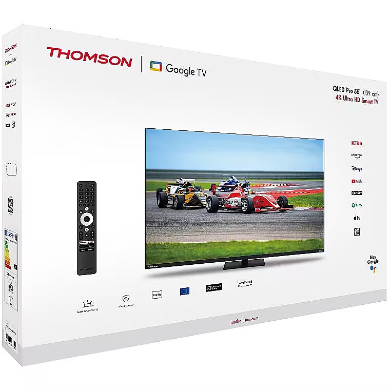 Description - Experience fluent images and high responsiveness in rich 4K UHD quality with the Thomson Google TV 55" QLED Pro. A 144 Hz refresh rate ensures smooth and responsive visuals, ideal for fast-paced content like action movies, sports and gaming. This feature reduces motion blur and display lag, delivering the most comfortable viewing and gaming experience. Powered by Quantum Dot nanocrystals, a QLED display delivers balanced brightness, striking contrasts, and an expanded color range. Combined with 4K Ultra HD resolution you can capture every detail and immerse yourself in crystal clear images. Dolby Vision technology enhances the brightness in each scene, ensuring precise color reproduction for lifelike images. Enjoy dynamic audio with Dolby Atmos for an immersive TV experience. Google TV simplifies your entertainment by organizing content from your apps and subscriptions. Create multiple user profiles and benefit from curated recommendations. Enjoy a wide range of smart features, such as access to 400,000+ movies and TV shows, smart voice control with Google Assistant, and Chromecast built-in to stream content from compatible smart devices to your TV. The ergonomic remote control with smooth backlighting allows you to keep an eye on everything, even in dim lighting. The integrated Google Assistant enables you to intuitively control your TV with voice commands. Search for your favorite movies, ask for recommendations based on your mood, or control compatible smart devices - all with the convenience of your voice. Benefit from increased placement flexibility with the central swivel stand and enhance your viewing experience. The innovative design enables you to effortlessly rotate your TV by up to 30 degrees, allowing you find the perfect angle for your entertainment setup. The built-in triple tuner makes reception via satellite-antenna, terrestrial antenna, or cable possible. Easily receive all available channels without additional hardware. 144 Hz Refresh Rate A 144 Hz refresh rate provides ultra-smooth motion and sharp visuals, perfect for high-speed gaming and fast-paced action scenes. With significantly reduced motion blur and improved responsiveness, it enhances your overall viewing and gaming experience. CHOOSE YOUR SIZE Whether you're outfitting a cozy living room or creating an immersive home theater experience, we've got you covered! From compact 43-inch models that fit any space to breathtaking 85-inch screens that redefine movie nights, our selection offers something for every room and viewing preference. Explore the Thomson Google TV QLED range to find the ideal fit for your space and style! DOLBY ATMOS Dolby Atmos creates a multi-dimensional sound environment on compatible audio systems that surrounds you, placing you at the center of the action. With precise sound placement and enhanced clarity, Dolby Atmos delivers an immersive listening experience that transforms how you enjoy music, movies, and games. 4K UHD + DOLBY VISION Dolby Vision transforms your viewing experience with vivid picture quality, bringing stunning colors, contrasts, and brightness to your screen. This technology ensures that every scene is rich in detail and depth, making entertainment lifelike and engaging. SMART VOICE CONTROL Google Assistant, allows you to easily navigate and control your TV with just your voice. Enjoy seamless integration with your smart home and the ability to play music, search for films or open apps, all with the convenience of voice commands.
