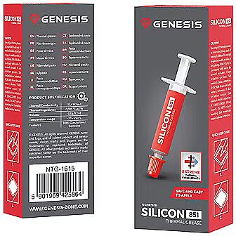 Description - SILICON 851 Genesis Silicon 851 is an extremely efficient thermal grease that will meet the high expectations of users looking for uncompromising solutions. THERMAL CONDUCTIVITY= 13,4W/mK Very high thermal conductivity will allow use of full potential that cooler provides. CONVINIENT SIZE Silicon 851 is enclosed in convinient-size syringe, which hold 0,5g/0,2ml thermal grease