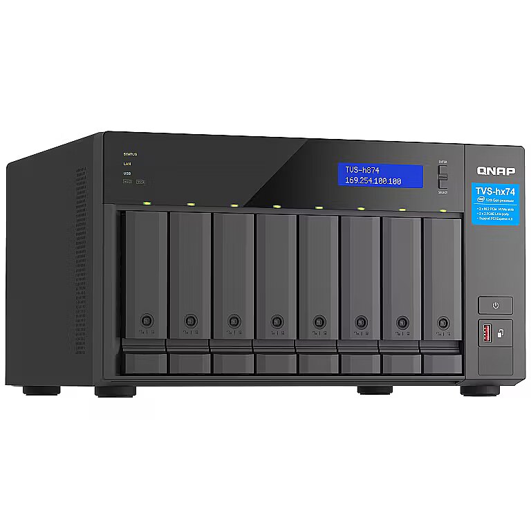 LongDesc - Visnota uzticama uz ZFS balstīta krātuve ar PCIe Gen 4 paplašināšanas iespēju 10/25GbE savienojamībai, M.2 NVMe SSD kešatmiņu un daudzdzīslu procesoriem virtualizācijas lietojumprogrammāmAr Intel® Core™ i5 sešu kodolu procesoru, kas atbalsta uz ZFS balstītu operētājsistēmu QuTS hero, TVS-h874 SMB NAS nodrošina datu integritāti un atbalsta bloku līmeņa datu deduplikāciju un saspiešanu, gandrīz neierobežotus momentuzņēmumus, SnapSync reālajā laikā un SSD optimizēšanu. Neatkarīgi no tā, vai tas paredzēts kritiski svarīgiem failu serveriem, virtualizācijas serveriem, kopīgai video rediģēšanai vai efektīvām datu dublēšanas un atjaunošanas lietojumprogrammām, TVS-h874 ir ideāls NAS risinājums. Augstas veiktspējas TVS-h874 nodrošina PCIe 4. paaudzes (līdz pat divreiz lielāks pārraides ātrums nekā 3. paaudzes) paplašināšanas iespēju, M.2 NVMe SSD kešatmiņu un 2,5 GbE savienojamību ātrgaitas virtualizācijas tīkla vidēm.M.2. PCIe Gen 4Izveidojiet NVMe SSD kešatmiņu vai ar Edge TPU aprīkotu mākslīgā intelekta attēlu atpazīšanu.2,5 GbE savienojamība2,5 GbE pieslēgvietas izceļas lietojumos, kas prasa lielu joslas platumu (tostarp masveida failu pārsūtīšana, ātrdarbīga dublēšana/atjaunošana, multivides straumēšana un virtualizācija).Leņķa paplašināšana PCIe Gen 4PCIe slots ļauj instalēt 2.5/5/5/10/25GbE adapterus, QM2 kartes vai sākumlīmeņa grafikas kartes, lai palielinātu lietojumprogrammu veiktspēju.Virtuālās mašīnas un konteineriVietot vairākas virtuālās mašīnas un konteinerus ar optimizētu resursu izmantošanu.Pilna HD HDMITiešā veidā skatiet radošos darbus HDMI displejā. Izbaudiet vienmērīgu Full HD multivides atskaņošanu un pārkodēšanu reālā laikā.Atšķirīgāku attēlu atpazīšanu ar mākslīgā intelekta paātrinājumuIebūvētais Intel® OpenVINO™ un Intel® UHD Graphics palīdz uzlabot mākslīgā intelekta attēlu atpazīšanu un atslogot procesora darba slodzi.Augstas veiktspējas Intel® Core™ procesors nodrošina līdz 4.4 GHzTVS-h874 izmanto Intel® Core™ i5 seškodolu procesoru ar Intel® UHD Graphics 770, lai palielinātu daudzuzdevumu veikšanas iespējas, piedāvājot maziem un vidējiem uzņēmumiem drošu, uzticamu un augstas veiktspējas NAS risinājumu.Spicināt NAS veiktspēju ar M.2 SSD vai TPUTVS-h874 ir divi M.2 PCIe slots, kas ļauj uzlabot SSD kešatmiņu vai SSD datu glabāšanas kopfondu veiktspēju, vai izmantot citas lietojumprogrammas.Istallējiet M.2 NVMe SSD kešatmiņas paātrināšanaiTVS-h874 atbalsta SSD kešatmiņu un tam ir divi M.2 slots, kas atbalsta M.2 PCIe NVMe SSD1 ar 2280 formātu (nopērkami atsevišķi), lai palielinātu kopējo NAS veiktspēju.Uzlabot attēlu atpazīšanu ar mākslīgo intelektu, izmantojot TPUPielietojot Google Edge TPU ar QNAP AI Core (ar mākslīgo intelektu darbināmu dzinēju attēlu atpazīšanai), TVS-h874 var veikt ātrdarbīgu seju un objektu atpazīšanu. Google Edge TPU ļauj QuMagie ātri apstrādāt tūkstošiem fotogrāfiju ar ātrdarbīgu AI attēlu atpazīšanu un klasifikāciju, bet QVR Face - analizēt reāllaika video momentānai sejas atpazīšanai.Izveidojiet ātrdarbīgu 2,5GbE tīkla vidiTVS-h874 ir divi 2,5GbE pieslēgvietu porti. QNAP piedāvā visaptverošus, budžetam draudzīgus glabāšanas un tīkla risinājumus, kas nodrošina virkni savienojamības iespēju. Viegli un elastīgi modernizējiet savu darbavietu vai mājas tīklu jau tagad, lai apstrādātu lietojumprogrammas, kas prasa lielu joslas platumu.Sprūdais 2,5GbE/10GbE NASKomplektējiet QNAP NAS ar vienu vai vairākām 2,5GbE/10GbE pieslēgvietām, un Port Trunking ļauj apvienot vairākas pieslēgvietas, lai palielinātu joslas platuma potenciālu.Upilnveidojiet datorus un serverusServeriem un galddatoriem var uzstādīt QNAP tīkla kartes uz PCIe bāzes, kas atbalsta 10G/5G/2,5G/1G/100M Multi-Gig.Papildiniet 5GbE pieslēgvietu klēpjdatoriemKlēpjdatoriem un datoriem ar ierobežotām iespējām veikt jauninājumus var izmantot QNAP portatīvo USB 3.2 Gen 1 uz 5GbE adapteri, kas ļauj pieslēgties 5G/2,5G/1G/100M tīkliem, izmantojot USB.Komutatoru, kas atbalsta 2,5GbE/10GbEQNAP 10GbE/NBASE-T komutatori atbalsta 10G/5G/2.5G/1G/100M un ļauj pieslēgt vairākas darbstacijas un ierīces, lai nodrošinātu ātrdarbīgu sadarbību ierīču blīvuma vidēs.Daudzpusīgas I/O iespējas ar PCIe paplašināšanuTVS-h874 ir divi PCIe slots, kas ļauj uzstādīt dažādas paplašināšanas kartes, lai paplašinātu lietojumu potenciālu.Ultimāla vizuālā pieredze ar Full HD HDMI izeju un video pārkodēšanu reālajā laikāHDMI izejaTransportierī TVS-h874 ir HDMI izeja, kas atbalsta Full HD izšķirtspēju, nodrošinot lieliskas priekšrocības tādām lietojumprogrammām kā video ražošana/rediģēšana vai rūpnieciskais dizains, kurās nepieciešama augsta izšķirtspēja un intensīva multivides datu glabāšana, pārsūtīšana un attēlošana.Apskatiet NAS multivides saturu vai virtuālās mašīnas televizorāSavienojot TVS-h874 ar HDMI displeju, varat tieši skatīties NAS saglabāto multivides saturu, darbināt virtuālās mašīnas no Virtualization Station vai baudīt multividi, izmantojot HD Player vai trešo pušu atskaņotājus, piemēram, Plex® Home Theater.Reālā laika pārkodēšana un displejsTVS-h874 ir aprīkots ar Intel® UHD Graphics, kas atbalsta aparatūras dekodēšanu un reālā laika pārkodēšanu*, lai konvertētu videoklipus universālos failu formātos, kurus var netraucēti atskaņot vairākās ierīcēs.*TVS-h874 nodrošina aparatūras dekodēšanas, kodēšanas un pārkodēšanas iespējas. Tomēr atskaņošanas kvalitāte var atšķirties atkarībā no dažādiem faktoriem (tostarp atskaņošanas programmatūras, failu formātiem, sistēmas izmantošanas un pieejamā joslas platuma).Atšķirīga attēlu atpazīšanas veiktspēja ar integrētu Intel® OpenVINO™ AI 