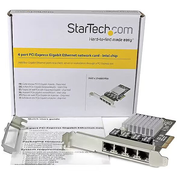 LongDesc - Add four Gigabit Ethernet ports to a client, server or workstation through a single PCI Express slotHere’s a dependable and cost-effective way to add four high-performance Gigabit Ethernet ports to your server or desktop computer, through one PCI Express slot.Reliable network connectivity with high performanceThis Gigabit Ethernet network card features the Intel® I350-AM4 chipset, designed to deliver the power, performance and enhanced capabilities you need for reliable network connections to your server or computer. The Intel chip provides a number of advanced driver options including IEEE 802.3ad link aggregation / teaming support, which enables you to add additional bandwidth to your system.Compliant with IEEE 802.3/u/ab standards, the network card provides full support for high-performance, four-channel networking and maximum throughput up to 1000Mbps in each direction (2000 Mbps total) - up to ten times faster than 10/100 Ethernet.Cost-effective access to multiple networksThe quad-port Gigabit network card makes it easy to access multiple networks. It offers a cost-effective solution for IT professionals in government, educational, corporate, health care, or business environments where access to multiple networks from numerous workstations is needed. The server adapter card gives you four redundant, independent Gigabit Ethernet ports and it supports advanced features such as Jumbo Frames and VLAN tagging.Enhanced versatility and efficiencyCompatible with a broad range of operating systems, this versatile PCIe Gigabit NIC is suitable for many business and enterprise applications - including virtualized environments with multiple operating systems, requiring multiple shared or dedicated NICs. The 4-port Gigabit network card is equipped with Intel® Virtualization Technology for Connectivity (Intel® VT-c) which reduces system latency and improves networking throughput. Four dedicated ports allow you to maximize your virtualized server’s networking efficiency and create a more agile data center.With a dual-profile design, the PCI Express network card installs easily into a wide range of computer/server chassis, regardless of form factor. The card is equipped with a full-sized bracket, and includes a low-profile/half-height installation bracket that you can use as needed.Enhance Productivity and Device Management with the StarTech.com Connectivity Tools ApplicationDeveloped to improve performance and security, StarTech.com Connectivity Tools is the only software suite on the market that works with a wide range of IT connectivity accessories. The software suite includes:•Mac Address Pass-Through Utility : To improve network security.•Wi-Fi Auto Switch Utility : Enabling users to quickly access faster network speeds via wired LAN.For more information and to download the StarTech.com Connectivity Tools application, please visit: www.StarTech.com/Connectivity-ToolsThe ST4000SPEXI is backed by a StarTech.com 2-year warranty and free lifetime technical support.The StarTech.com Advantage