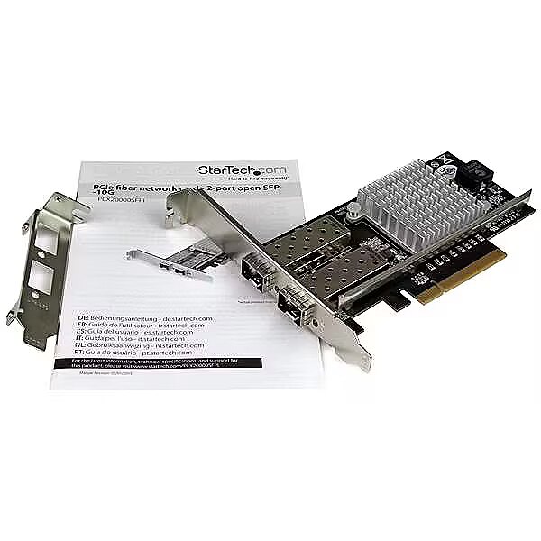 LongDesc - Add two 10 Gigabit Fiber Ethernet ports (10 Gbps per port) to your server or workstation - using the SFP+ transceiver of your choiceGet fast, high-bandwidth connectivity with this cost-effective fiber network card. It adds two open SFP+ slots to your server or high-powered workstation, giving you an easy way to connect your server or workstation to a 10 Gigabit fiber network using the SFP+ modules of your choice.Transfer files at faster speedsLarge file transfers, multimedia content and increased numbers of network users create constant pressures for more bandwidth in your network infrastructure. This fiber NIC lets you harness the speed and stability of a 10 Gigabit network. The NIC supports data transfers at up to 10Gbps per port, or up to 20Gbps per port in full-duplex mode.Add scalable network connections to your server or workstationThe fiber NIC is compatible with most 10GbE SFP+ transceivers, giving you flexible configuration options to connect your computer directly to a fiber network at greater distances.The card features two open SFP+ slots with support for interchangeable SFP+ modules, including the StarTech.com 10GBase-SR SFP+ Fiber Transceiver Module (SKU: SFP10GSRST). This gives you the option to use the modules that best suit your network needs based on distance and connector type. StarTech.com SFP+ Cables provide a dependable solution for linking telecom and data communications equipment, such as routers and switches.Enhance your network capabilitiesThe 10 Gigabit network card features the Intel® 82599 chipset, designed to deliver the power, performance and enhanced capabilities you need for reliable network connections to your server or computer. The Intel chip offers many advanced features including Intel® Virtualization Technology for connectivity, PXE network boot support and up to 15K jumbo frame support.Enhance Productivity and Device Management with the StarTech.com Connectivity Tools ApplicationDeveloped to improve performance and security, StarTech.com Connectivity Tools is the only software suite on the market that works with a wide range of IT connectivity accessories. The software suite includes:•Mac Address Pass-Through Utility : To improve network security.•Wi-Fi Auto Switch Utility : Enabling users to quickly access faster network speeds via wired LAN.For more information and to download the StarTech.com Connectivity Tools application, please visit: www.StarTech.com/Connectivity-ToolsThe PEX20000SFPI is backed by a StarTech.com 2-year warranty and free lifetime technical support.The StarTech.com Advantage