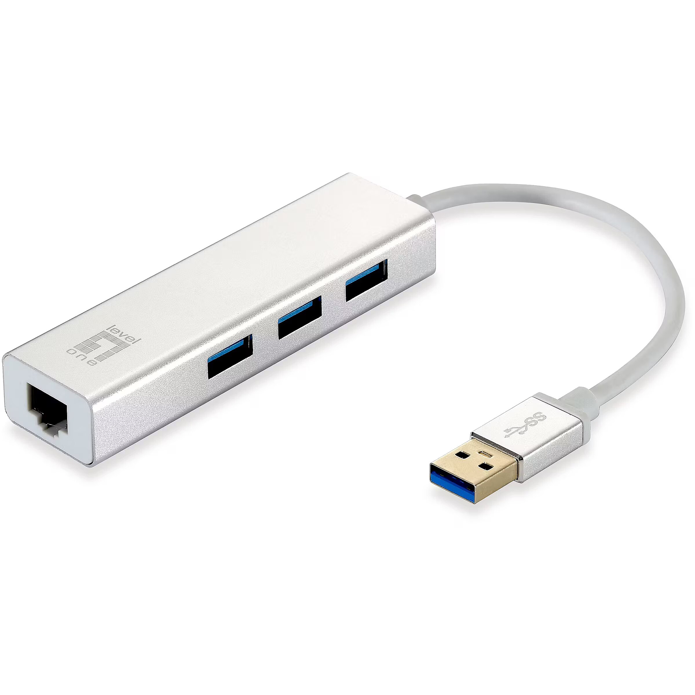 LongDesc - Fast and easy connection with USBThe LevelOne USB Hub and Gigabit Ethernet Combo Adapter allows you to connect to the internet easily through the built-in USB port on your laptop. Now you no longer need to have an Ethernet connection in order to surf the web. This is an ideal solution for MacBook or other Windows computers that may have wireless built-in but don’t come with an Ethernet port. Sometimes you need to physically connect to a network cable to help transfer files or access secure information. The USB-0503 easily does the job, all through your USB port. The USB-0503 also combines a regular USB hub. So you can connect external USB peripherals, such as a MP3 player, digital camera, printer or pen drive. The USB-0503 establishes a direct point-to-point contact between the hub and the adapter that\\\'s plugged into your PC.Reliable, efficient and standards compliantThe USB-0503 is USB 1.0, 2.0, and 3.0 compliant. It also follows the Ethernet standards set by the IEEE 802.3/3u and 802.3ab, allowing you to take advantage of Gigabit Ethernet speeds of up to 1000Mbps. This provides a strong backbone for any high-speed broadband connection to the internet as well as fast speeds for the Local Area Network file transfers.