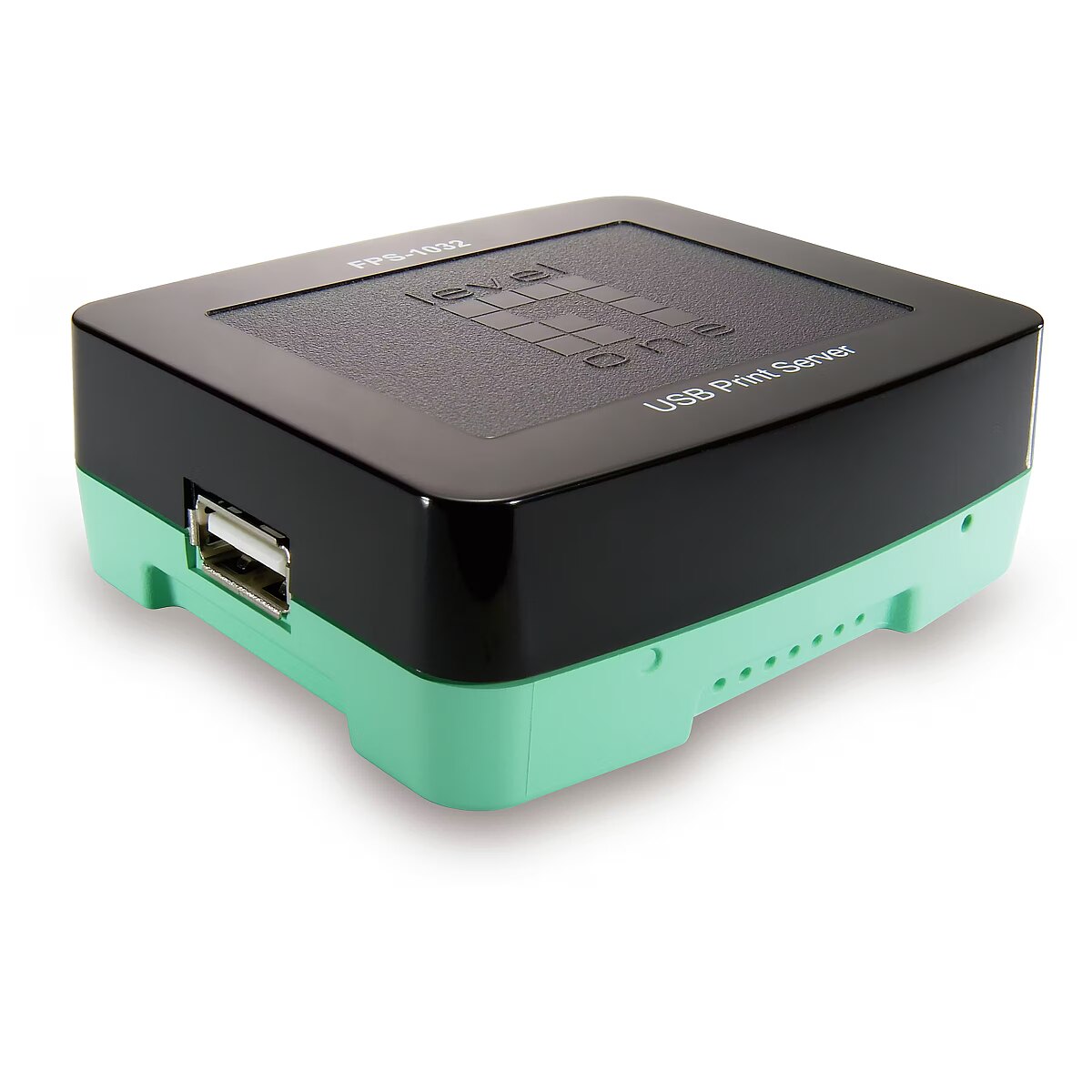 LongSummaryDescription - LevelOne USB Print Server. Product colour: Black, Green, LED indicators: Activity, Link, Power, Status, Country of origin: Taiwan. Network connection type: Ethernet LAN, Networking standards: IEEE 802.3, IEEE 802.3u, Ethernet LAN data rates: 10,100 Mbit/s. Supported network protocols: TCP/IP, IPX, NetBEUI, AppleTalk, LPR, RAW TCP, SMB over TCP/IP. USB connector type: USB Type-A. Windows operating systems supported: Windows 2000, Windows 7 Enterprise, Windows 7 Enterprise x64, Windows 7 Home Basic, Windows 7 Home..., Mac operating systems supported: Mac OS 8.1, Mac OS 8.5, Mac OS 8.6, Mac OS 9.0, Mac OS 9.1, Mac OS 9.2, Other operating systems supported: Novell NetWare 3.x, Novell NetWare 4.x, Novell NetWare 5.x, Novell NetWare 6.x