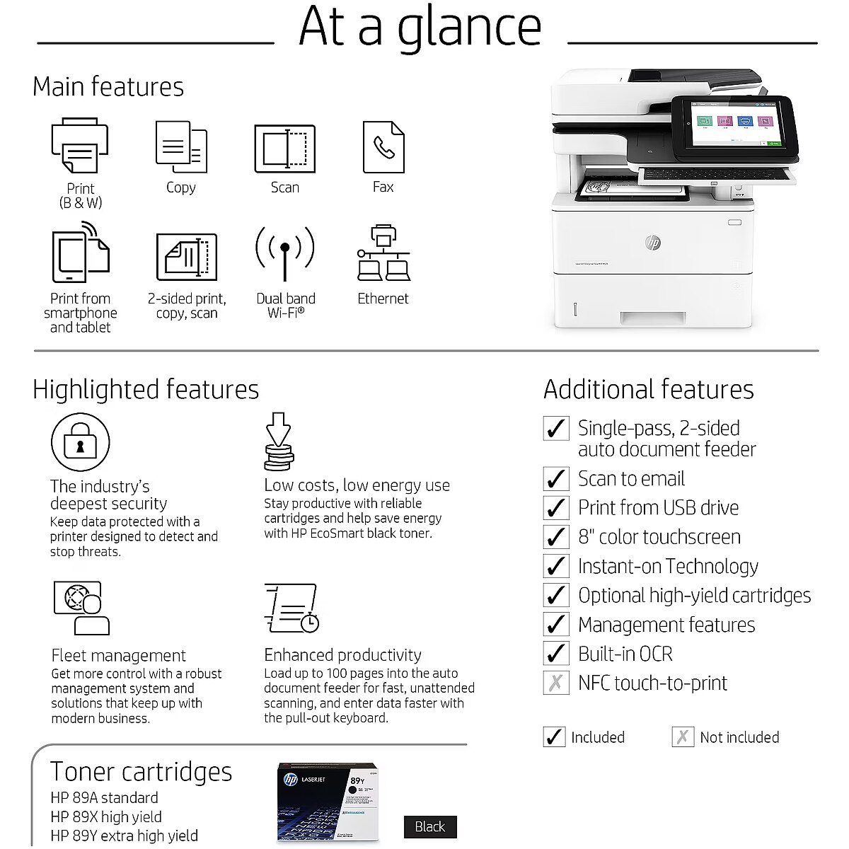 LongDesc - Choose an HP LaserJet Enterprise MFP designed to handle business solutions securely and efficiently, and helps conserve energy with HP EcoSmart toner black. Keep up with the demands of growing business with a printer you can rely on.[1]Dynamic security enabled printer Certain HP printers are intended to work only with cartridges that have a new or reused HP chip or electronic circuitry. These printers use dynamic security measures to block cartridges using a non-HP chip or electronic circuitry. Periodic firmware updates will maintain the effectiveness of these measures and block cartridges that previously worked. Reused HP chips and electronic circuitry enable the use of reused, remanufactured, and refilled cartridges.