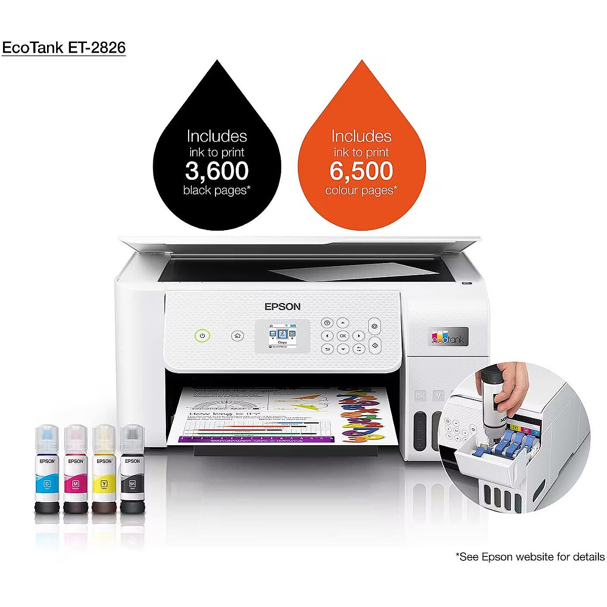 ShortSummaryDescription - Epson EcoTank ET-2826, Inkjet, Colour printing, 5760 x 1440 DPI, A4, Direct printing, White