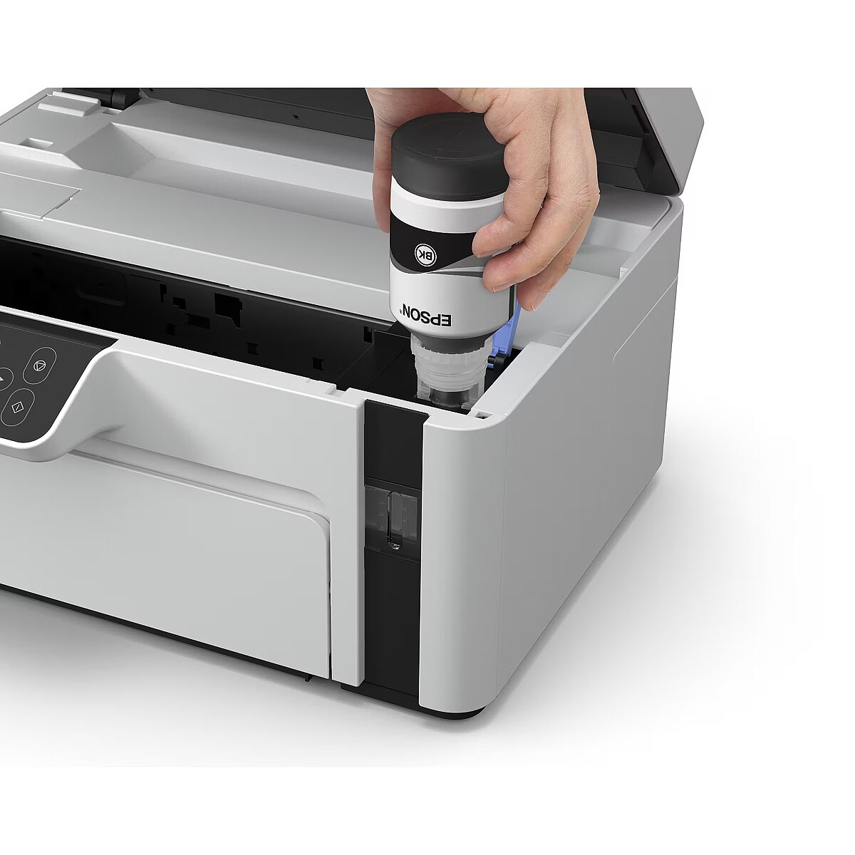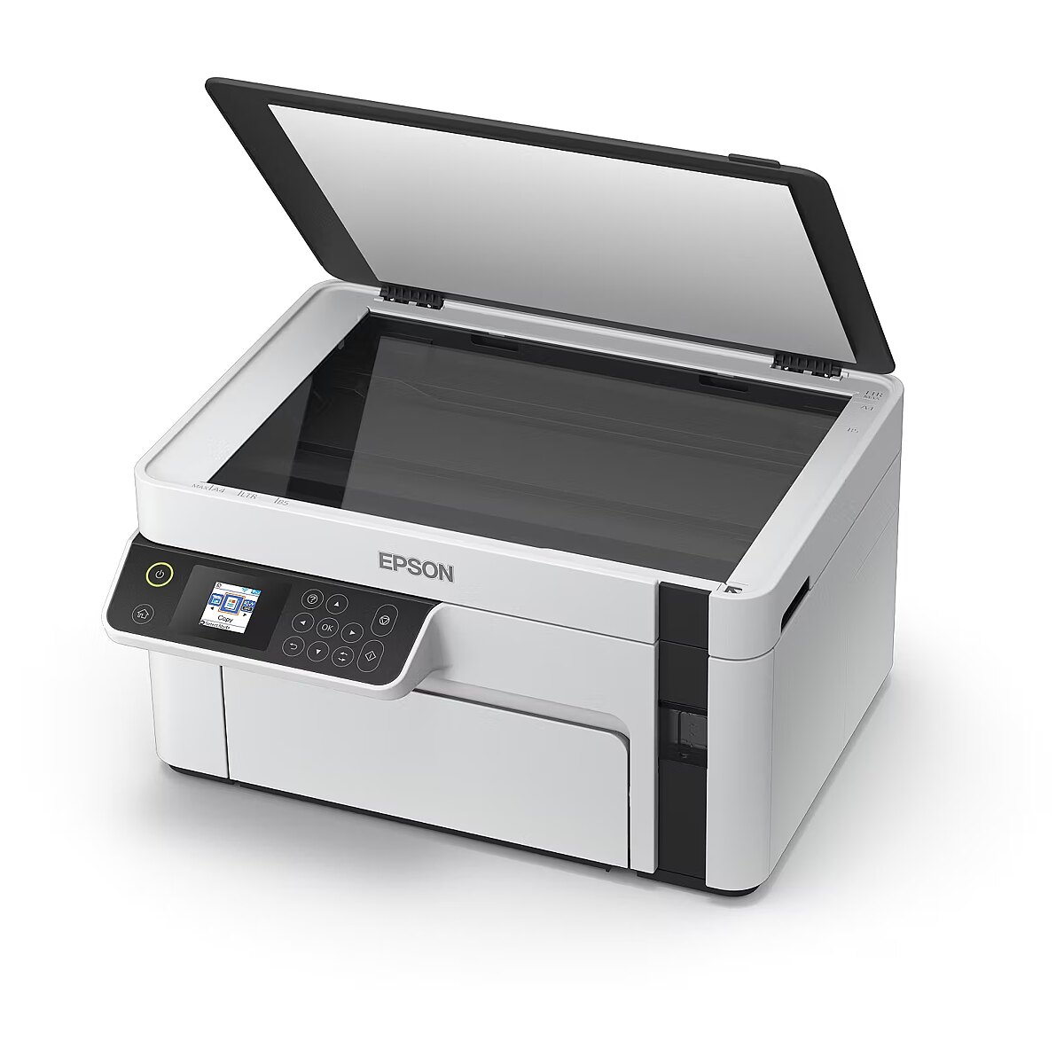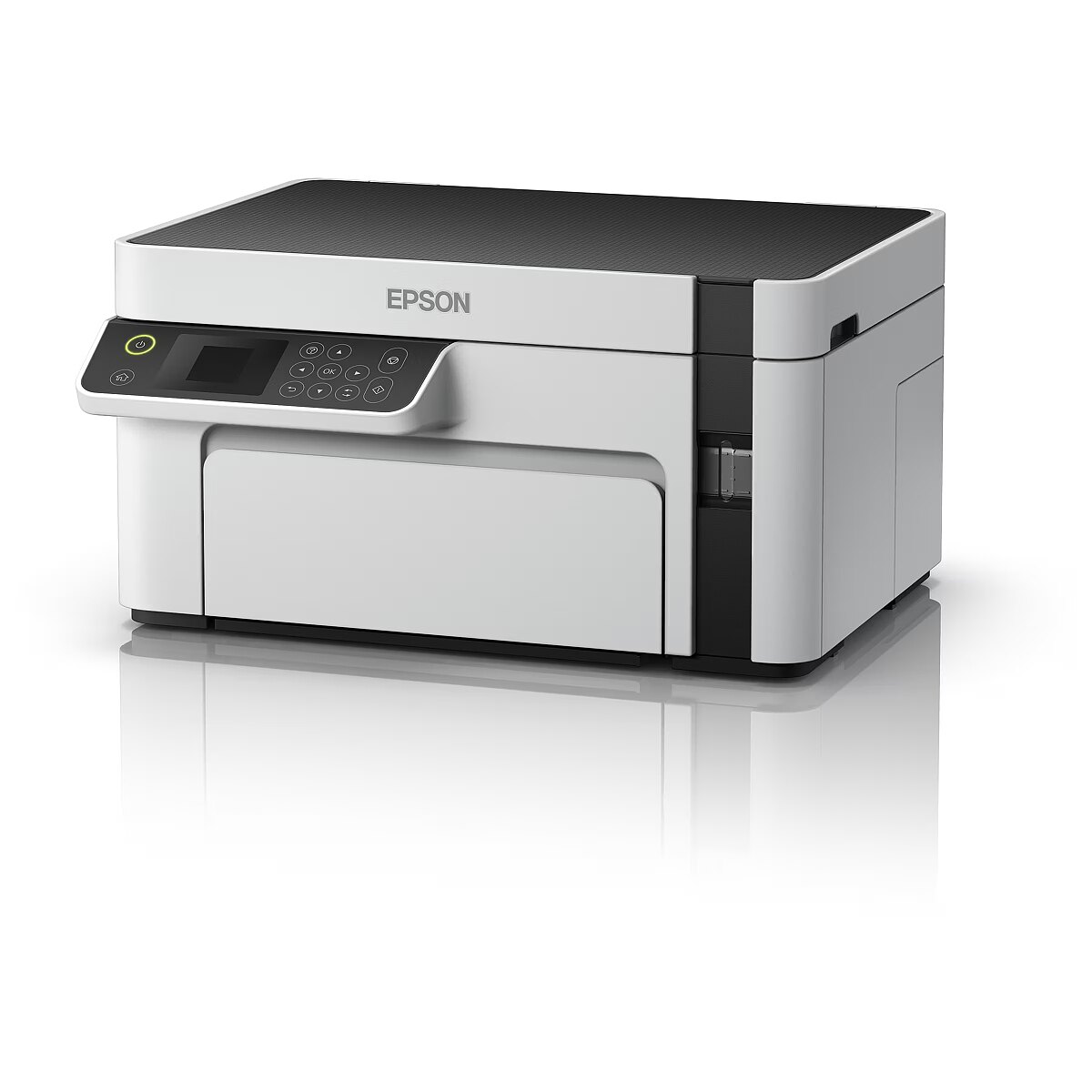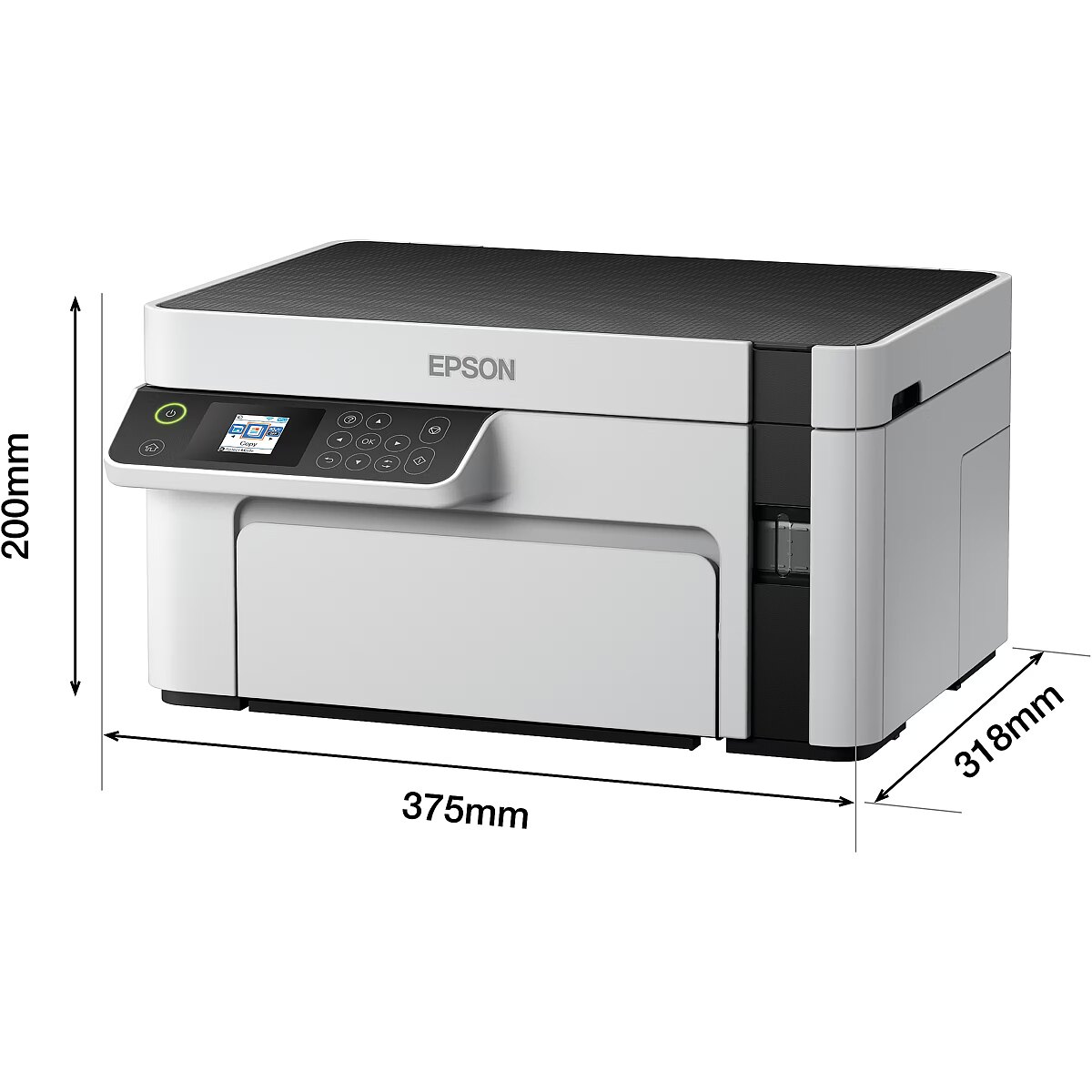 Technical_details - EcoTank ET-M2120, multifunction printer Low printing costs and three functions: The EcoTank ET-M2120 from Epson is an innovative multifunction printer for small work groups or the home office. It has a large, refillable ink tank - ink is now filled directly instead of cartridges, which significantly reduces printing costs. The scope of delivery of this device, which offers a flatbed scanner and a copier function in addition to the black-and-white printing function, already contains ink for up to 5000 pages. The ET-M2120 can be connected to a PC via USB or integrated into a network via WLAN. Type: multifunction printer EAN: 8715946670362 Manufacturer No.: C11CJ18401 Connections: 1x USB-B 2.0 Communication: WiFi direct printing, WLAN Formats: A4, A5, A6, B5, B6, C6, DL (DIN long), legal, no. 10 Media: plain paper Operation: function keys Display: 3.7 cm (1.45") LC display Consumables: Ink: 111 Ecotank black (C13T03M140) up to 6000 pages Compatible: Windows XP, Windows Vista, Windows 7, Windows 8, Windows 10, Windows 2003 Server, Windows 2008 Server, Windows 2012 Server, Windows 2016 Server Subjects: Paper | Tray 1: 150 sheets Subjects: Output | Tray 1: 30 sheets Printer: Print Area | 210x297mm Printer: Resolution | Black | 1440x720dpi Printer: Printing Technology | Kind | Monochrome inkjet printing Printer: Print Volume | one-time monthly peak usage | 15000 sheets Printer: Speed | Black | Black (A4): 32 ppm, Black (ISO A4): 15 ppm Printer: Speed | reprints first page after | 8s Scanner: Color | 2400x1200dpi Scanner: Black | 2400x1200dpi Scanner: Scan Feeder | flatbed Power supply: mains voltage | AC 220 - 240V (50Hz/60Hz) Power supply: energy consumption | Operation | 15 watts Power supply: energy consumption | Standby | 4.3 watts Feature: Apple AirPrint, Supported print services: Epson Connect (iPrint, Email Print, Remote Print Driver). Paper weights supported: 64 gsm - 90 gsm. Scanner with CIS sensor. Scan output formats: BMP, JPEG, PICT, TIFF, multi-TIFF, PDF, PNG. Accessories: available | Power cord, quick start guide, user guide, ink up to 5000 pages Dimensions: device | Width: 375mm x Height: 200mm x Depth/Length: 318mm Weight: 5kg