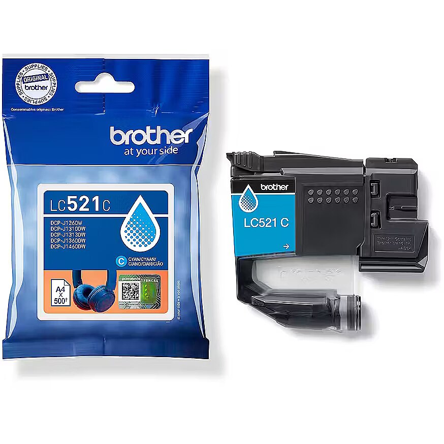 LongSummaryDescription - Brother LC521C Genuine Ink Cartridge - Cyan. Supply type: Single pack, Colour ink page yield: 500 pages, Printing colours: Cyan, Quantity per pack: 1 pc(s)