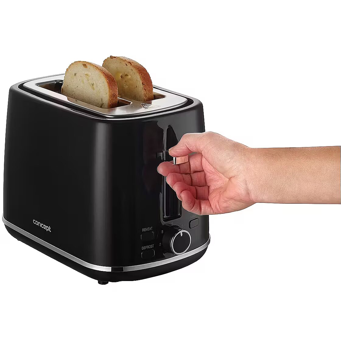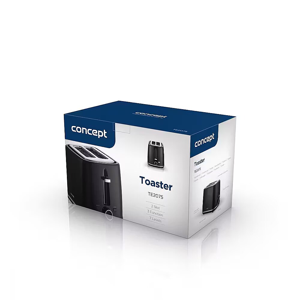 Toster Concept TE2075 umożliwia szybkie i łatwe przygotowanie chrupiących tostów. Dzięki 7 poziomom opiekania możesz cieszyć się tostami dokładnie według własnego gustu, niezależnie od tego, czy lubisz lekko przypieczone, czy doskonale złociste tosty. Posiada dwa otwory do opiekania oraz funkcje rozmrażania, podgrzewania i natychmiastowego zakończenia podgrzewania. Po upływie ustawionego czasu opiekania gotowe pieczywo zostanie automatycznie wysunięte i urządzenie wyłączy się.