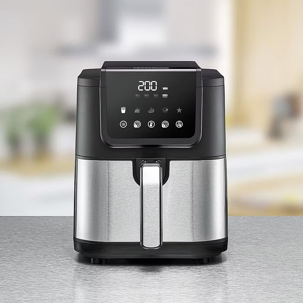 Technical_details - The hot air fryer FRH 1500 XL from Rommelsbacher is the ideal choice for low-fat, healthier preparation of snacks and small, quick meals. From fries, rolls, wings and muffins to steaks and cakes and from savory to sweet, dishes, side dishes, finger food and snacks can now be prepared with low fat, time and energy efficiency. The compact device cuts a fine figure in every kitchen. The innovative Hot Air Convection Technology ensures optimal heat distribution and pleasantly quiet operation. Five individually adjustable programs, four temperature levels up to 200°C and the 60-minute timer make operation pleasantly easy; just lightly tapping the sensors is enough. Using the FRH 1500 hot air fryer is reassuringly safe. This is ensured by the heat-insulated housing, the safety switch, the overheating protection and the non-slip feet. Thanks to the use of high-quality materials and the 2-layer non-stick coating, subsequent cleaning is also very easy. The FRH 1500 is a contemporary addition for households that value a simple, healthier and more efficient way of cooking. Item no.: 100036657 Air fryer type Color black/stainless steel EAN 4001797813015 Manufacturer no. FRH 1500 XL Timer 60 minute timer, beep Hot air cooking method Equipment 1 frying basket, adjustable thermostat Capacity 5 liters Operation: Start / Stop / Pause button, 4 temperature levels (80° / 160° / 180° / 200°C) Capacity of fried food 0.8 kg Temperature range min. 80 °C, max. 200 °C Hot air circulation functions Cleaning non-stick coating, removable container Mains operation mode Power 1,500 watts Input voltage 230 volts Safety overheating protection, heat-insulated housing, safety circuit, anti-slip/suction feet Notes Shake/Turn Reminder Feature Hot Air Convection Technology: Even heat distribution, quiet operation Dimensions Width: 22 cm x Height: 29 cm x Depth/Length: 40 cm Weight 4.5kg