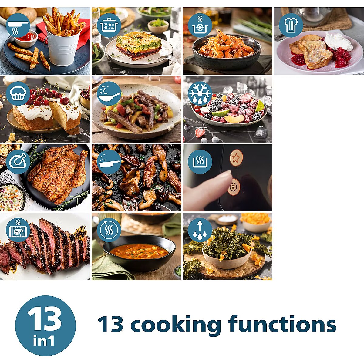 programs - Frying Smoking Grilling Baking One-pot cooking Chinese stir-frying Low-fat frying Cooking frozen food Heating Defrosting Drying Toasting Keeping warm