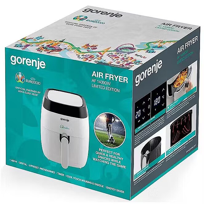 LongSummaryDescription - Gorenje AF1409DW. Produkta tips: Siltā gaisa fritēze. Produkta krāsa: melna, balta, Vadības veids: Materiāls: skārienjūtīgs, Materiāls: Materiāls: Metāls. Jauda: 1400 W. Platums: 280 mm, dziļums: 306 mm, augstums: 340 mm. Iepakojuma platums: 385 mm, Iepakojuma dziļums: 332 mm, Iepakojuma augstums: 325 mm.