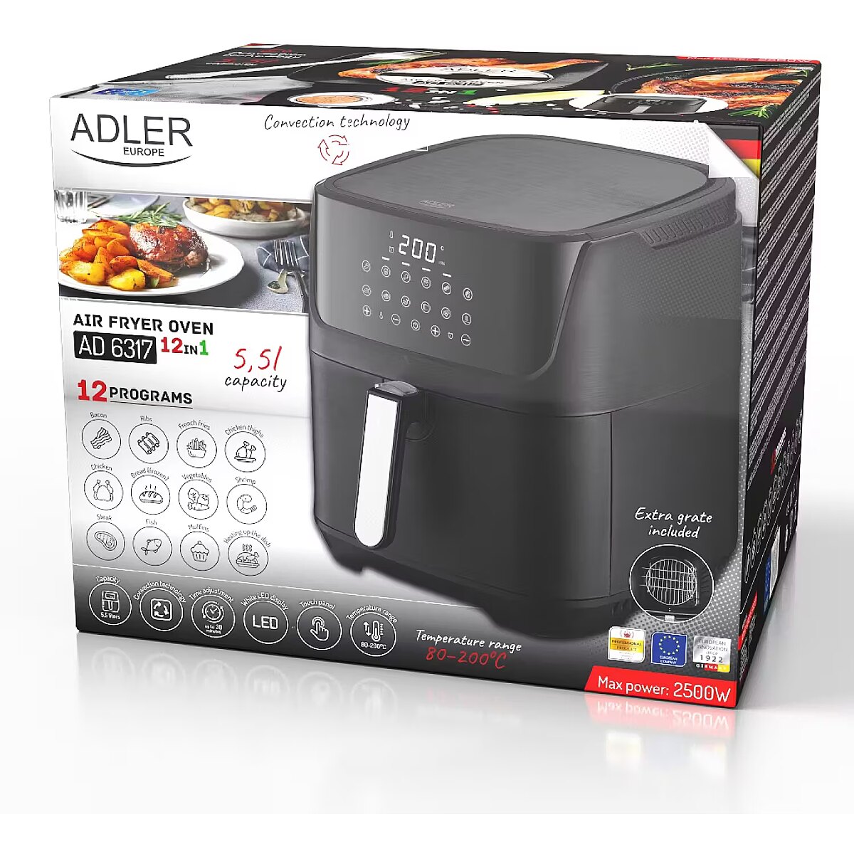 Name - Adler Air Fryer Oven | AD 6317 | Power 1800-2500 W | Capacity 5.5 L | Convection | Black