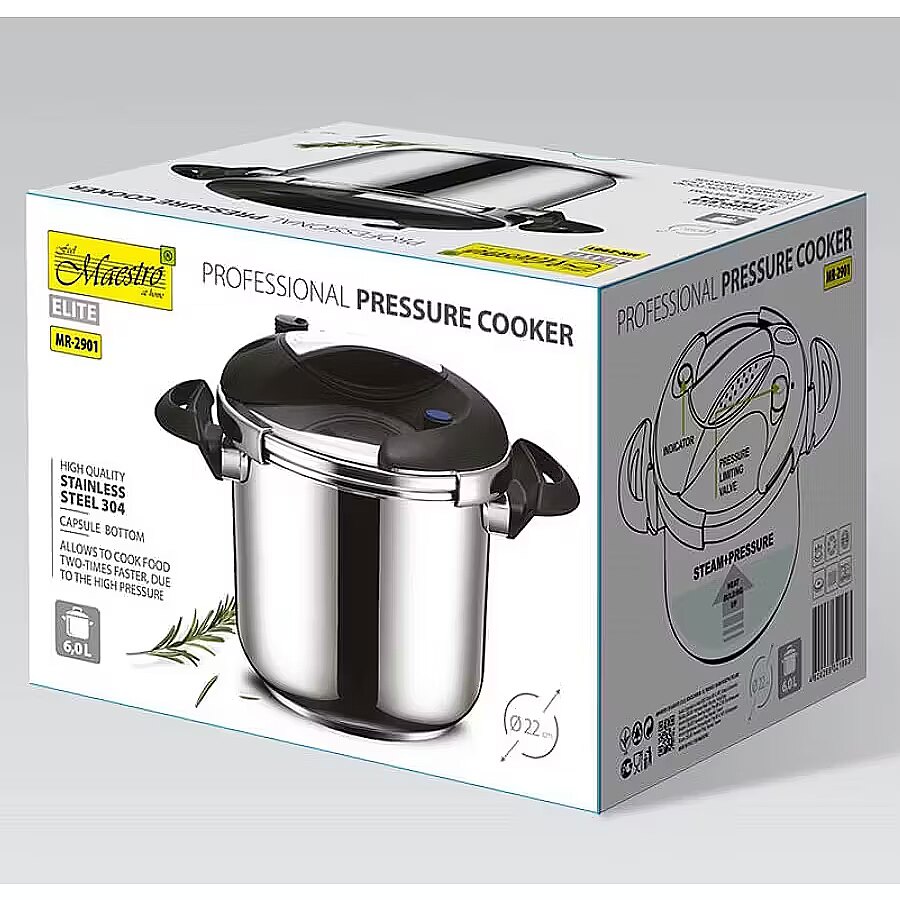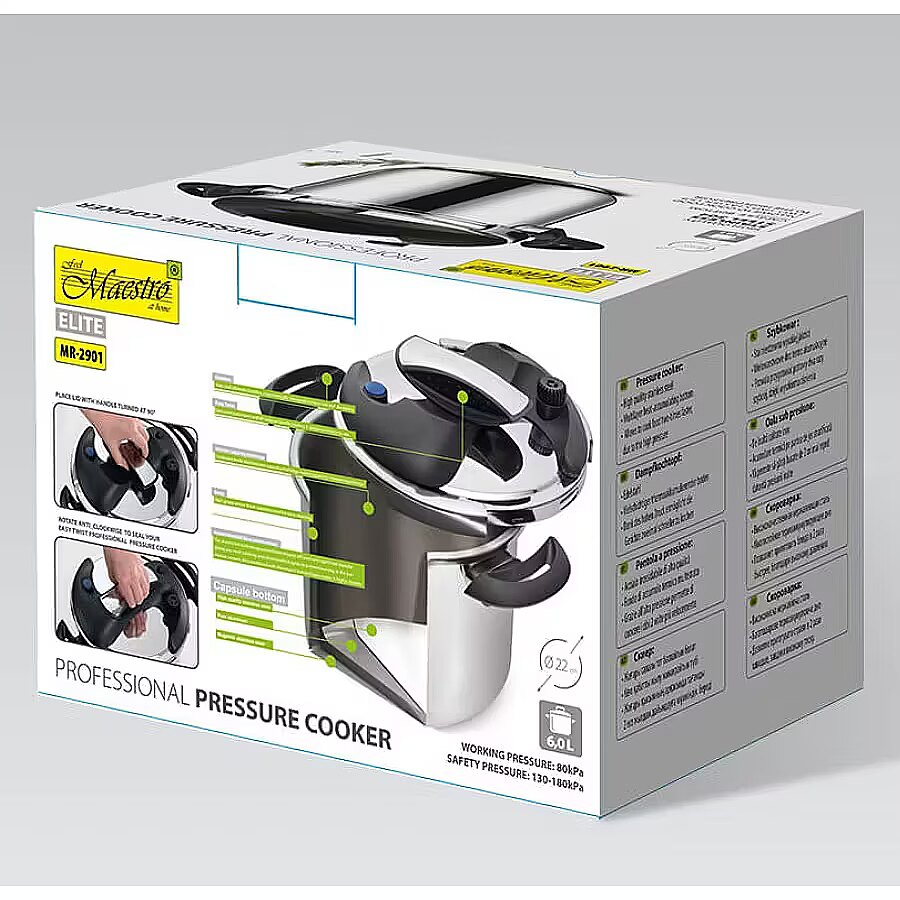 Description - Maestro MR-2901 Pressure Cooker The Maestro MR-2901 pressure cooker is a versatile appliance designed for quickly preparing meals. With a capacity of 6.0L, it allows you to cook portions for a larger family or prepare several dishes at once. The pot has a diameter of 22 cm, making it practical for use on standard stovetops. Operating pressure is 80 kPa, with a maintained pressure range of 130-180 kPa, ensuring efficient and fast pressure cooking while guaranteeing user safety. Made of high-quality stainless steel, it offers durability and easy cleaning. Product dimensions are 23 x 37 x 25.5 cm, making it compact and easy to store in a cabinet without taking up much space. It features a lid with a sealing ring and a 90-degree rotating handle, making operation simple and convenient.