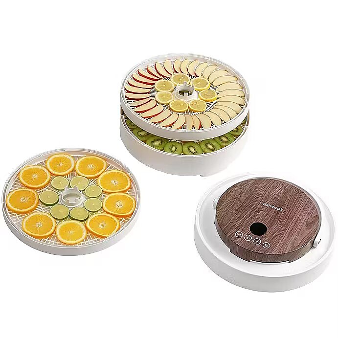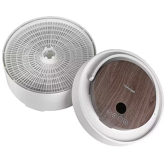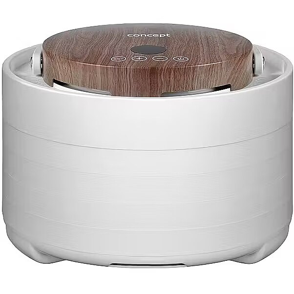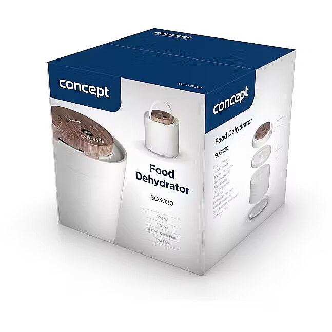 Description - Innovative Design with Motor in the Lid The Concept SO3020 food dehydrator impresses with its modern design, featuring a lid with an elegant wood finish and a practical handle for easy handling. It offers 7 drying trays and an intelligent design solution, with the motor located directly in the lid. This placement protects it from damage caused by dripping juice or food particles that may fall during drying. Its stylish appearance combined with practical details makes the dehydrator not only functional but also an aesthetically pleasing appliance in any kitchen. Even Drying During drying, hot air flows through the openings in each tray from top to bottom and is distributed throughout the interior of the dehydrator by the fan. This ensures the SO3020 model provides even drying on all levels. Healthy Food Preservation Year-Round Drying is one of the gentlest methods of food preservation, retaining valuable vitamins and minerals. It is also a year-round method that allows you to easily process fruits, vegetables, mushrooms, herbs, flowers, or pasta. The dehydrator also helps prepare tasty treats for pets and RAW dishes that are not exposed to temperatures above 42 °C. Intuitive Touch Control with Temperature and Time Settings The SO3020 dehydrator features intuitive digital touch controls with a clear display. It allows easy setting of the temperature from 35 to 70 °C and selection of drying time via the timer. At the end of the process, an audible signal sounds, and the dehydrator automatically turns off.