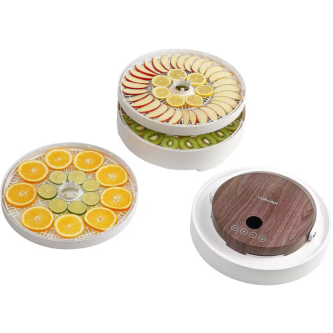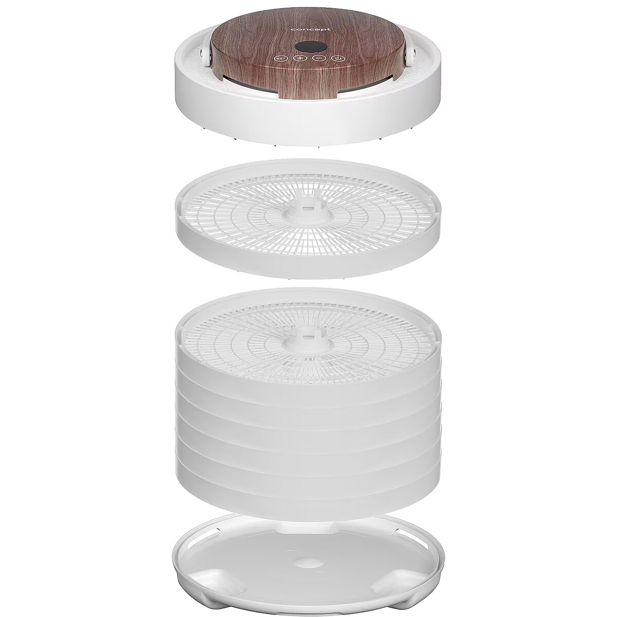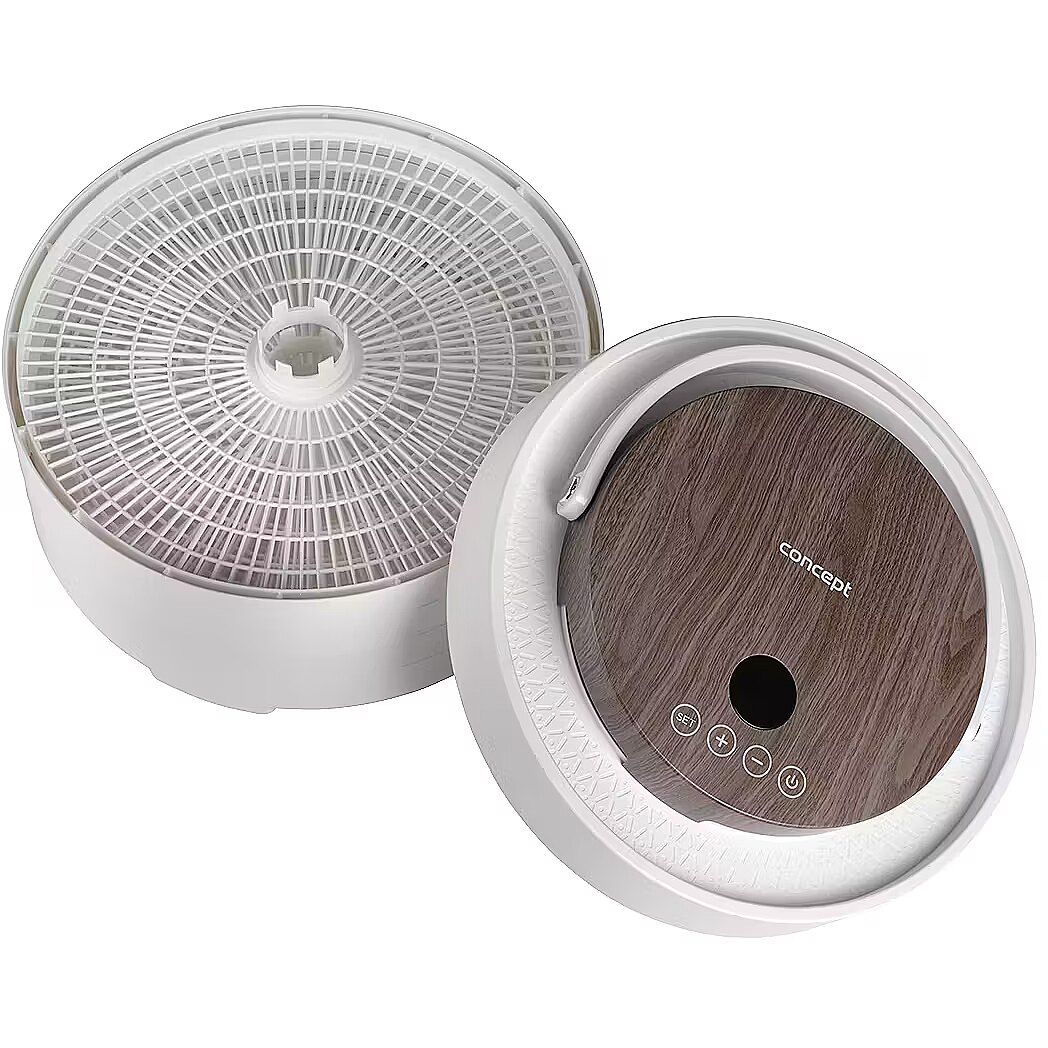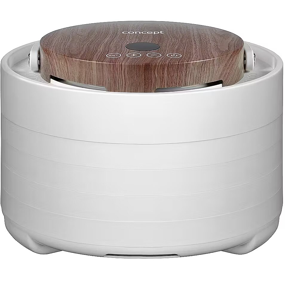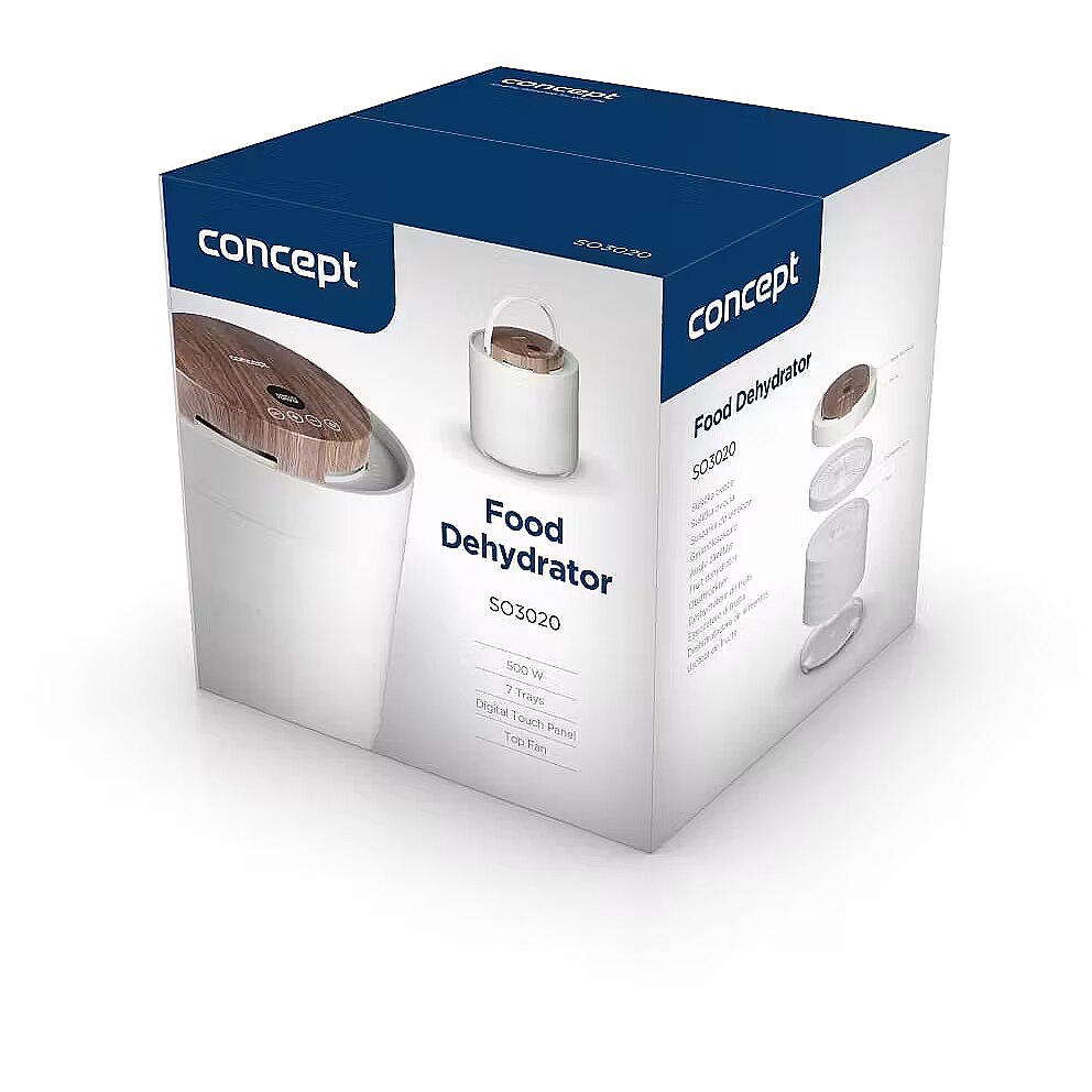Description - Innovative Design with Motor in the Lid The Concept SO3020 food dehydrator impresses with its modern design, featuring a lid with an elegant wood finish and a practical handle for easy handling. It offers 7 drying trays and an intelligent design solution, with the motor located directly in the lid. This placement protects it from damage caused by dripping juice or food particles that may fall during drying. Its stylish appearance combined with practical details makes the dehydrator not only functional but also an aesthetically pleasing appliance in any kitchen. Even Drying During drying, hot air flows through the openings in each tray from top to bottom and is distributed throughout the interior of the dehydrator by the fan. This ensures the SO3020 model provides even drying on all levels. Healthy Food Preservation Year-Round Drying is one of the gentlest methods of food preservation, retaining valuable vitamins and minerals. It is also a year-round method that allows you to easily process fruits, vegetables, mushrooms, herbs, flowers, or pasta. The dehydrator also helps prepare tasty treats for pets and RAW dishes that are not exposed to temperatures above 42 °C. Intuitive Touch Control with Temperature and Time Settings The SO3020 dehydrator features intuitive digital touch controls with a clear display. It allows easy setting of the temperature from 35 to 70 °C and selection of drying time via the timer. At the end of the process, an audible signal sounds, and the dehydrator automatically turns off.