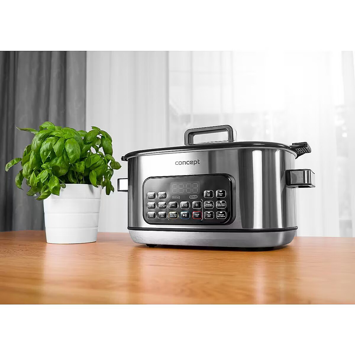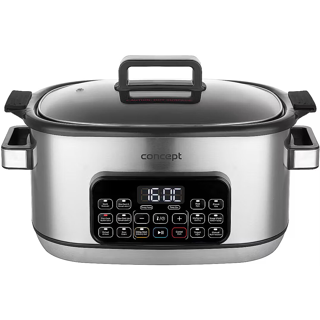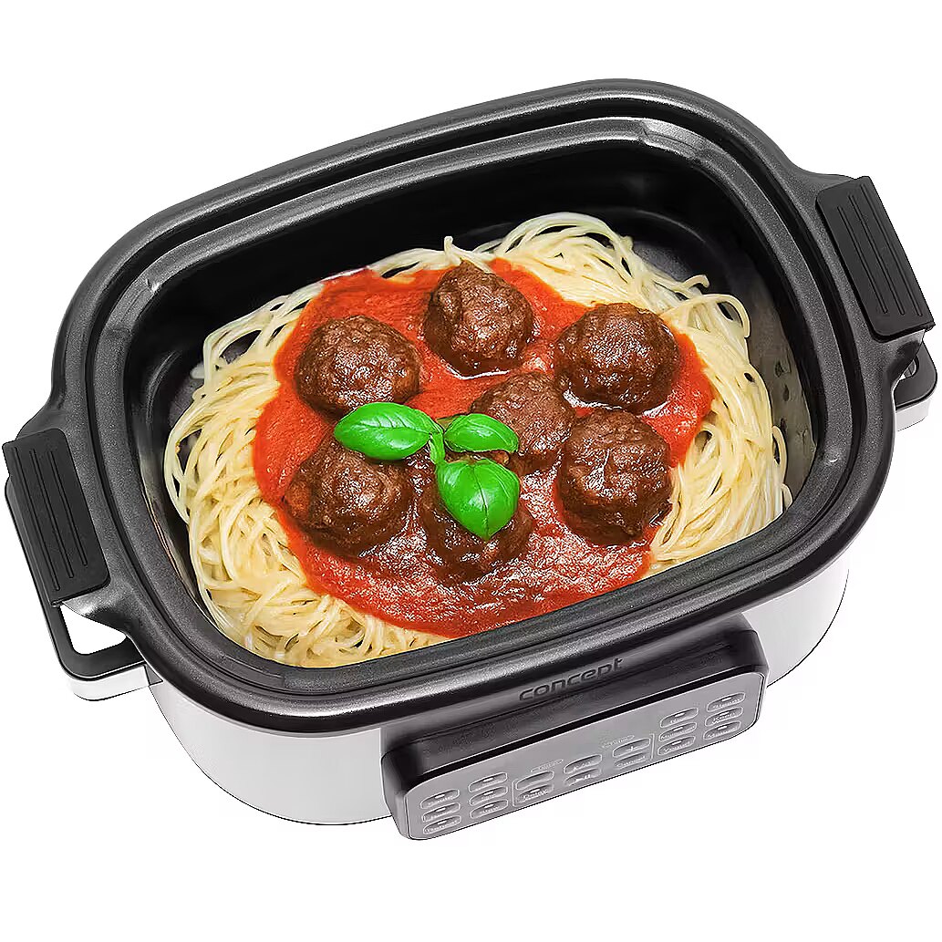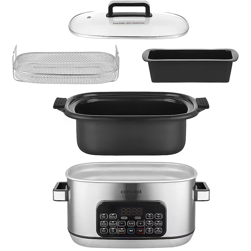 Description - Effortless Smart Cooking - at Home and on the Go The Concept CK9000 multifunction slow cooker is a practical helper that saves time, energy, and countertop space. It offers 10 automatic programs, including slow cooking and steaming, making it easy to prepare a wide variety of dishes. The tempered glass lid allows you to monitor cooking without opening it. Thanks to its compact size, the pot is easy to transport-perfect for a summer house or holidays. The Concept CK9000 is an excellent choice for anyone who wants to cook simply, deliciously, and stress-free. A mini recipe booklet is also included for a quick start. 6-Liter Non-Stick Ceramic Pot The large 6-liter pot with a non-stick ceramic coating is ideal for preparing bigger portions without worrying about burning. The ceramic retains heat exceptionally well, ensuring even cooking and keeping dishes warm for longer after cooking. The surface is easy to clean and dishwasher safe. Additionally, the ceramic is safe for health and gentle on ingredients, helping dishes retain their natural flavor and nutrients. Slow Cooking: Minimum Effort, Maximum Flavor Slow cooking is a perfect way to effortlessly prepare tasty and nutritious meals. Its suitable for meat, soups, sauces, legumes, and desserts that need time to fully develop their flavor. Cooking at low temperatures for a longer time keeps ingredients juicy, flavorful, and nutrient-rich. The pot offers two temperature levels, making it easy to adjust cooking to your dish. A major advantage is that you dont need to watch over the cooking-thanks to the non-stick ceramic pot, nothing will burn, allowing you to focus on other tasks. Steaming Steaming with the included basket is a healthy and gentle cooking method that preserves maximum nutrients, flavor, and the natural color of ingredients. The steam basket ensures even cooking without the need for added fat or oil, making it ideal for light and healthy meals. Cooking is simple and quick-just place the ingredients in the basket, select the program, and wait for tender, juicy results. Wide Range of Programs and Easy Operation in English The multifunction slow cooker offers 10 preset programs, including low- and high-temperature slow cooking, sautéing, baking, warming, braising, cooking rice, grains, and legumes, yogurt making, and steaming. Theres also a manual mode for custom settings. Operation is straightforward thanks to the digital display and clear English-language panel. Practical functions such as Keep Warm maintain the dish at the ideal serving temperature, and the delayed start function lets you schedule cooking to fit your needs. Silicone Baking Mold The slow cooker comes with a practical silicone baking mold, whose non-stick surface allows easy preparation of both sweet and savory dishes. Its perfect for bundt cakes, loaf cakes, classic bread, and many other treats. The silicone material is flexible, easy to clean, and opens up creative cooking possibilities directly in the pot. Safe Cooking The slow cooker is equipped with an overheat protection system that automatically switches off the device if it overheats. This protects both the appliance and your dish while minimizing the risk of accidents. You can cook with confidence, knowing your pot is safe even during long cooking sessions.