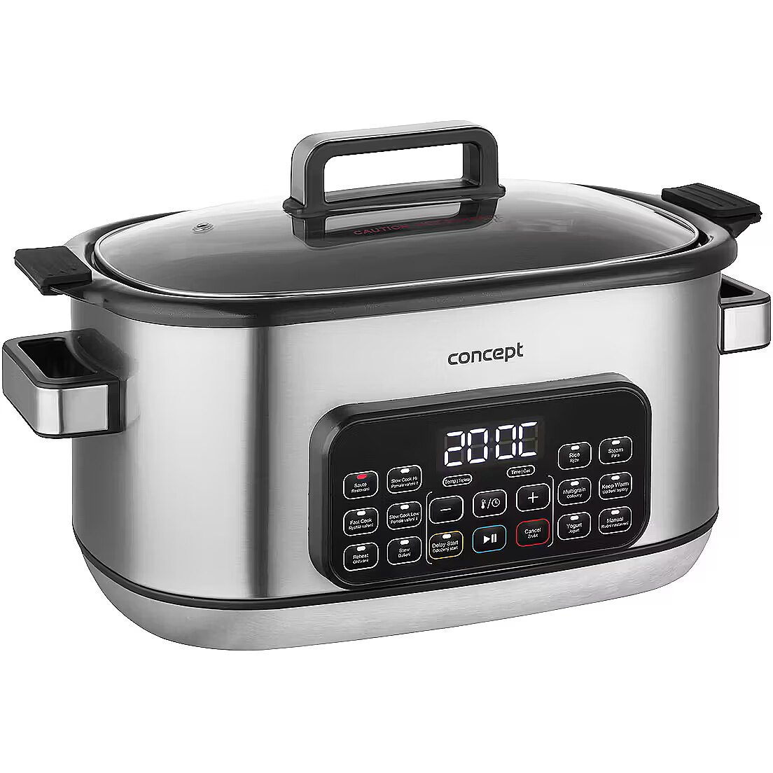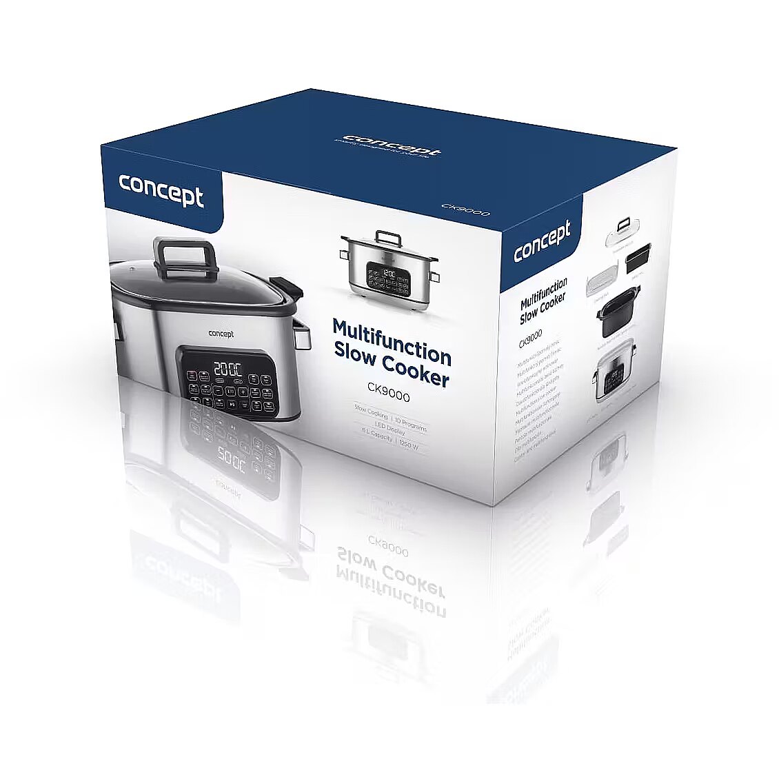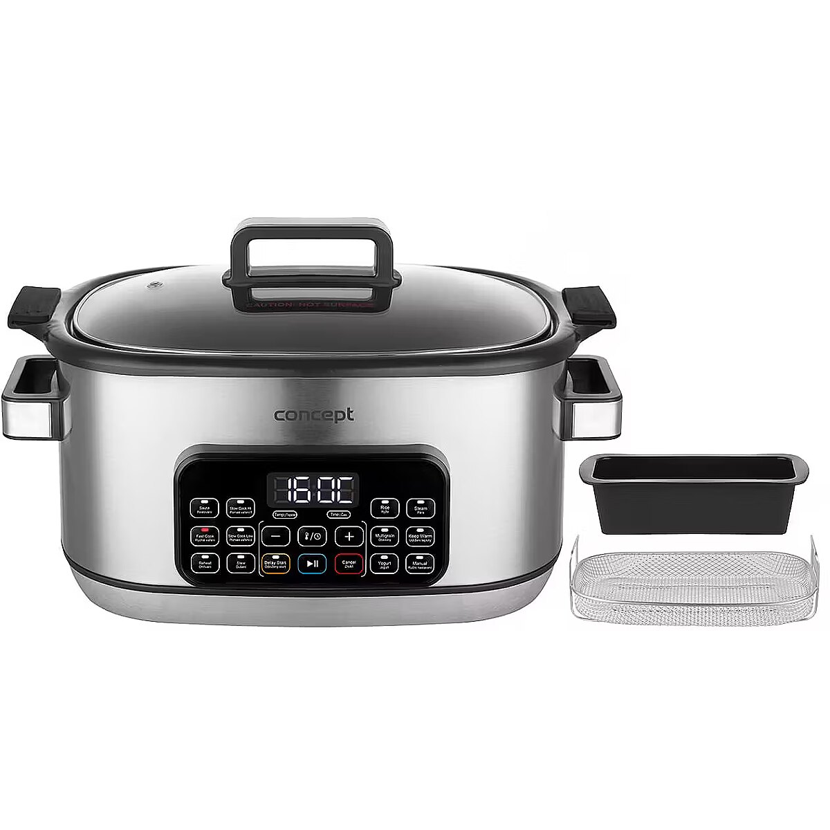 Description - Effortless Smart Cooking - at Home and on the Go The Concept CK9000 multifunction slow cooker is a practical helper that saves time, energy, and countertop space. It offers 10 automatic programs, including slow cooking and steaming, making it easy to prepare a wide variety of dishes. The tempered glass lid allows you to monitor cooking without opening it. Thanks to its compact size, the pot is easy to transport-perfect for a summer house or holidays. The Concept CK9000 is an excellent choice for anyone who wants to cook simply, deliciously, and stress-free. A mini recipe booklet is also included for a quick start. 6-Liter Non-Stick Ceramic Pot The large 6-liter pot with a non-stick ceramic coating is ideal for preparing bigger portions without worrying about burning. The ceramic retains heat exceptionally well, ensuring even cooking and keeping dishes warm for longer after cooking. The surface is easy to clean and dishwasher safe. Additionally, the ceramic is safe for health and gentle on ingredients, helping dishes retain their natural flavor and nutrients. Slow Cooking: Minimum Effort, Maximum Flavor Slow cooking is a perfect way to effortlessly prepare tasty and nutritious meals. Its suitable for meat, soups, sauces, legumes, and desserts that need time to fully develop their flavor. Cooking at low temperatures for a longer time keeps ingredients juicy, flavorful, and nutrient-rich. The pot offers two temperature levels, making it easy to adjust cooking to your dish. A major advantage is that you dont need to watch over the cooking-thanks to the non-stick ceramic pot, nothing will burn, allowing you to focus on other tasks. Steaming Steaming with the included basket is a healthy and gentle cooking method that preserves maximum nutrients, flavor, and the natural color of ingredients. The steam basket ensures even cooking without the need for added fat or oil, making it ideal for light and healthy meals. Cooking is simple and quick-just place the ingredients in the basket, select the program, and wait for tender, juicy results. Wide Range of Programs and Easy Operation in English The multifunction slow cooker offers 10 preset programs, including low- and high-temperature slow cooking, sautéing, baking, warming, braising, cooking rice, grains, and legumes, yogurt making, and steaming. Theres also a manual mode for custom settings. Operation is straightforward thanks to the digital display and clear English-language panel. Practical functions such as Keep Warm maintain the dish at the ideal serving temperature, and the delayed start function lets you schedule cooking to fit your needs. Silicone Baking Mold The slow cooker comes with a practical silicone baking mold, whose non-stick surface allows easy preparation of both sweet and savory dishes. Its perfect for bundt cakes, loaf cakes, classic bread, and many other treats. The silicone material is flexible, easy to clean, and opens up creative cooking possibilities directly in the pot. Safe Cooking The slow cooker is equipped with an overheat protection system that automatically switches off the device if it overheats. This protects both the appliance and your dish while minimizing the risk of accidents. You can cook with confidence, knowing your pot is safe even during long cooking sessions.