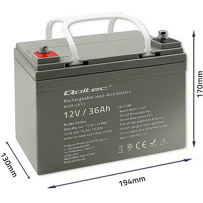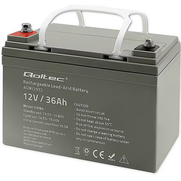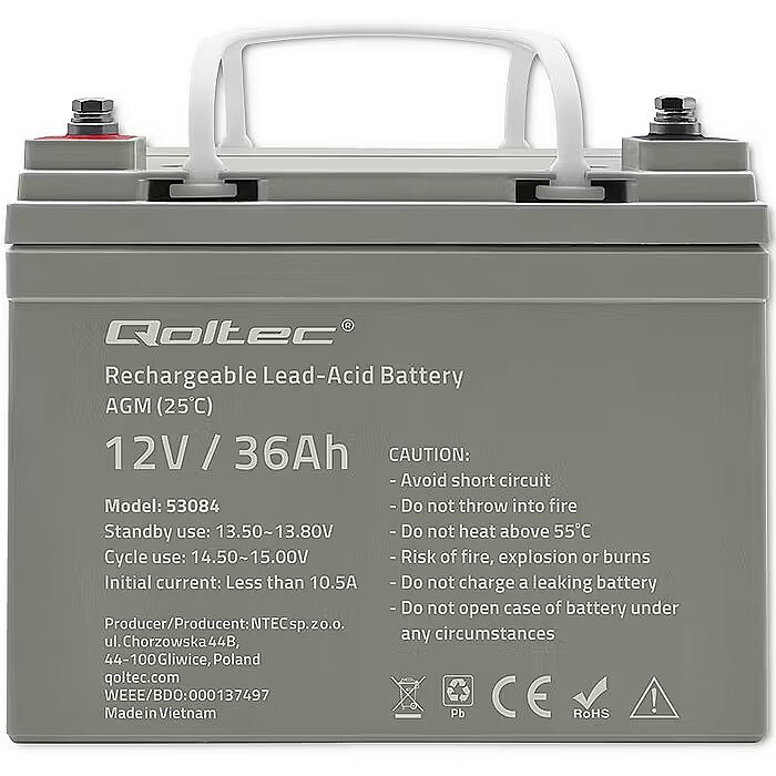 Apraksts - Jūsu stabils enerģijas avots ikdienai un brīvdienām Veicot ikdienas darbus vai strādājot, jūs noteikti izmantojat ierīces, kuru pareizai darbībai nepieciešama elektrība. Dažas no tām saņem enerģiju no elektrotīkla un ir pakļautas sprieguma svārstībām vai strāvas padeves pārtraukumiem. Nevainojamai darbībai ir nepieciešams avārijas enerģijas avots. Tās ir: - signalizācijas un monitoringa sistēmas, - avārijas apgaismojums, - medicīnas iekārtas, - svari un kases aparāti. Citām iekārtām ir iekšdedzes dzinēji, un tās ir atkarīgas tikai no akumulatora enerģijas. To vidū ir: - kvadracikli, - iekrāvēji, - motorolleri, - laivas, - kemperi. Lai nodrošinātu tos ar stabilu un drošu enerģijas avotu, esam sagatavojuši plašu risinājumu klāstu. Iepazīstieties ar Qoltec AGM akumulatoru piedāvājumu un izvēlieties savām vajadzībām vispiemērotāko variantu. Nepalieciet pārsteigti. Uzziniet, kā AGM akumulators darbojas vislabāk Interesējaties, kur mūsu akumulatoru vislabāk izmantot? Kā primārais barošanas avots vai kā rezerves barošanas avots ierīcēm, kas parasti ir pieslēgtas elektrotīklam? Atbildēsim godīgi: mēs iesakām 36 Ah AGM akumulatoru izmantot bufera darbībai. Kāpēc? AGM tehnoloģijai ieteicams buferrežīms Izmantotais akumulators darbosies ļoti efektīvi un baudīs ilgu kalpošanas laiku - līdz pat 10 gadiem, kā avārijas barošanas avārijas barošanas avārijas režīmā buferrežīmā, piemēram, UPS barošanas avotiem, signalizācijas sistēmās, avārijas apgaismojumā vai iekšdedzes transportlīdzekļos. Kas ir AGM tehnoloģija? AGM (Absorbent Glass Mat) tehnoloģija, kurā ir izstrādāti mūsu akumulatori, nozīmē, ka akumulatorā esošo elektrolītu uzsūc īpaši paklāji, kas izgatavoti no ļoti porainas stikla šķiedras, kas novietota starp svina plāksnēm, kuras klātas ar paklājiem. Šis risinājums ļauj pagarināt akumulatora darbības laiku, pateicoties lēnam izlādes procesam. Uzticams no visām pusēm - ar AGM akumulatoru darbināmu ierīču drošība Jūtieties droši AGM akumulatoru priekšrocība neapšaubāmi ir to, ka tiem nav nepieciešama apkope, un to uzticamība tiek saglabāta ilgu laiku. Tas ir iespējams, pateicoties konstrukcijai, ko raksturo: - korpusa hermētiskums, - triecienizturība, - iespēja uzstādīt dažādās pozīcijās. Iegādājoties 36Ah AGM akumulatoru, jūs saņemat pilnīgu uzticamības garantiju. Vai vēlaties, lai jūsu iekārtas strādātu ar pilnu jaudu bez ierobežojumiem? Tagad varat būt droši, ka tas saņems nepieciešamo enerģiju bez kompromisiem. Ilgstošs akumulatora darbības laiks - baudiet enerģiju daudz ilgāk! Vēl viena mūsu akumulatoru priekšrocība ir to bezaprūpes darbības laiks, kas ļauj tiem strādāt līdz pat 10 gadiem! Tas ir iespējams, pateicoties augstākās kvalitātes sastāvdaļu, tostarp tīra (nepārstrādāta) svina, izmantošanai. Tajā nav nekādu piemaisījumu, kas varētu samazināt akumulatora jaudu. Tikmēr korpuss ir veidots, izmantojot augstas kvalitātes materiālus, lai maksimāli pagarinātu akumulatora kalpošanas laiku, aizsargājot tā iekšpusi. Rūpējieties par savu akumulatoru, un tas kalpos jums daudzus gadus Atcerieties, ka AGM akumulatora pareizai lietošanai un kopšanai ir izšķiroša nozīme tā kalpošanas ilguma nodrošināšanā. Bieža un dziļa izlāde noteikti pozitīvi neietekmēs tā efektivitāti. Lai akumulators kalpotu ilgi, centieties: - izvairīties no dziļas izlādes, - nodrošināt pareizu uzlādi - neuzlādēt akumulatoru ar pārāk lielu strāvu, - izvairīties no ļoti zemas temperatūras vai ilgstošas augstas temperatūras iedarbības - izmantot konkrētajam akumulatora tipam piemērotu lādētāju. Kā pareizi uzlādēt AGM akumulatoru, lai tas kalpotu visilgāk? AGM akumulatorus nepieciešams uzlādēt ar tā saukto pastāvīga sprieguma metodi, sākumā ar līdzstrāvu, bet pēc tam ar pastāvīgu spriegumu. Šādā veidā jūs varat izvairīties no riska sabojāt akumulatoru nepareizas uzlādes dēļ.