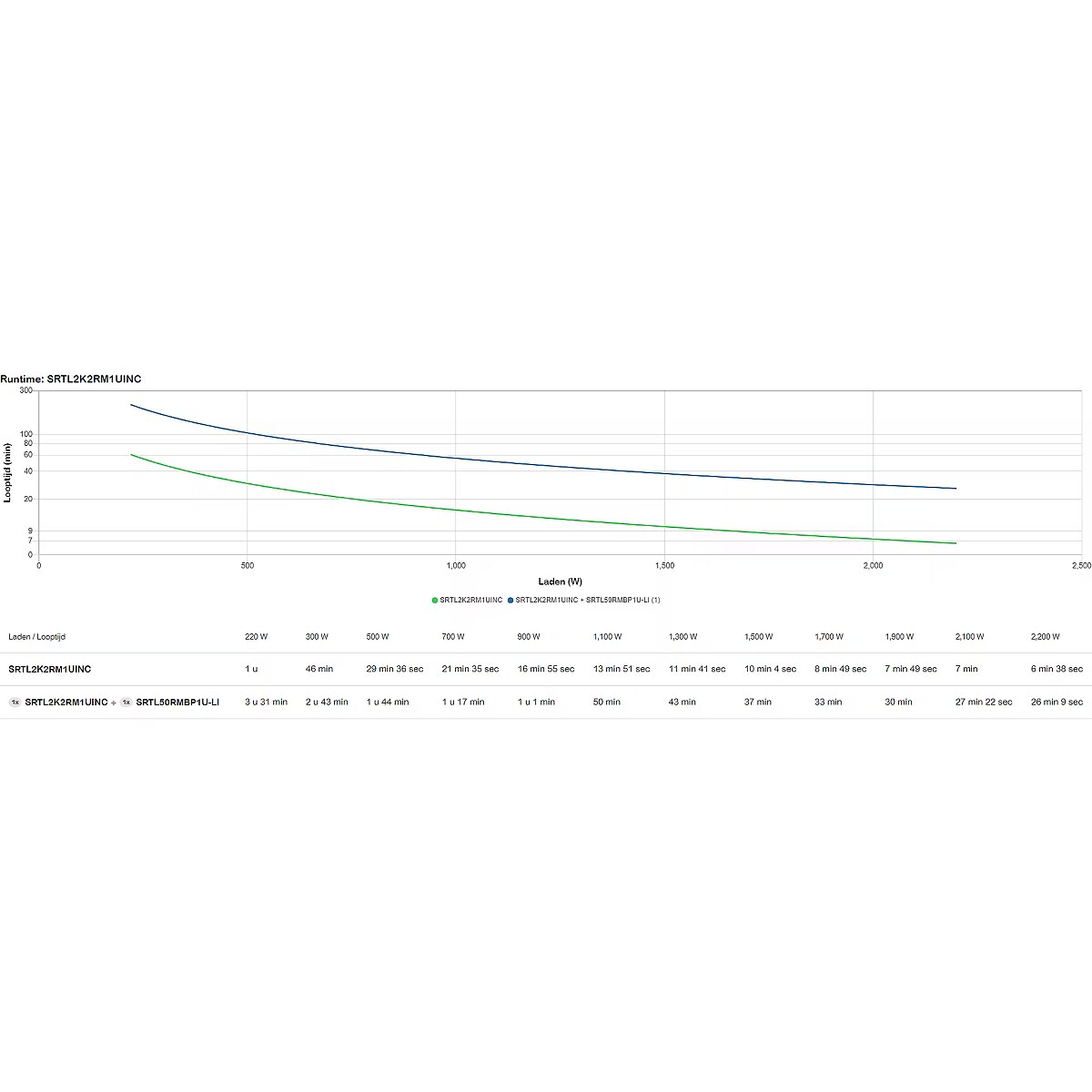 LongDesc - Stay always online and prevent data lossAn APC Smart-UPS Ultra On-Line Li-Ion always supplies perfectly clean power to all connected equipment thanks to its double conversion technology. Even power outages have no influence on this. The APC Smart-UPS On-Line then automatically supplies emergency power without having to switch. This way you prevent unwanted failure of, for example, a server, storage or switch. With the integrated network card and associated APC PowerChute Network Shutdown software, the UPS can send a shutdown signal via the network to multiple physical and/or virtual servers and have them shut down automatically and in a controlled manner when the UPS battery is almost empty. This way you prevent data loss, downtime and physical damage to hardware.UltraThanks to next-gen semiconductor technology, this APC Ultra UPS delivers 2200W in just a 1U form factor. Lithium-IonThe APC SRTL2KRM1UINC uses Li-Ion batteries, which provides unique advantages:-Longer life span. Li-Ion batteries can last up to 10 years, making the UPS truly maintenance-free.-Smaller and lighter. Li-Ion batteries are smaller and weigh approximately 30% less than lead acid batteries, saving space, 2U form factor and simplifying installation.-Better performance at high temperature. Li-Ion batteries perform well at high ambient temperatures (up to 40°C), in contrast to lead acid batteries where this is at the expense of battery life.-5 year manufacturer's warranty. Standard long warranty on the UPS including the battery.-Lower costs: The above benefits reduce the total costs over the entire lifespan of the UPS by up to 53% (compared to a UPS with lead-acid batteries.)Battery lifeYou can easily read the expected battery life in the runtime graph, which you can find between the product images. You can easily see how long the UPS supplies emergency power at a certain load.Extend the runtimeYou can easily increase the number of minutes that the APC SRTL2KRM1UIC can independently supply emergency power by connecting a maximum of 1 additional external battery pack (SRTL50RMBP1U-LI).Manage your Smart-UPSThanks to the integrated network card, you can easily connect the APC UPS to your network. This way you can monitor and manage the UPS remotely (SNMP) and the UPS can send a shutdown signal to multiple physical and/or virtual servers using PowerChute Network Shutdown software.PowerChute Network ShutdownPowerChute Network Shutdown is UPS management software that works with the UPS Network Management Card to protect Windows, Linux and Host ESXi, as well as hyperconverged and virtual infrastructure*. In the event of a power outage, PowerChute can properly shut down your virtual machines and the preconfigured boot sequence ensures they are turned back on.*An additional license is required for HCI and virtual machine support: 1 year: SWPCNS1Y-DIGIUp to (Replace the bold number in the article number for the desired variant)6 years: SWPCNS6Y-DIGIRemote management and monitoring of your networkThe network card can be managed remotely via the easy-to-use web browser interface, remote management software EcoStruxure™ IT (SFTWES1-DIGI) or another SNMP-compatible system. Tip EcoStruxure™ IT also includes the functionalities of the support contract below.Support contractThe optional network card support contract license* ensures that you are always up to date and secure and includes additional benefits such as frequent updates with:• New and improved features• Security updates• Advanced support(The support contract functionality is included free of charge in the first year of the UPS)*The above license and available in the variants: 1 year: SWNMC3SU-1Y-DIGIUp to (Replace the bold number in the article number for the desired variant)6 years: SWNMC3SU-6Y-DIGIAvailabilityThe Smart-UPS On-Line has an internal bypass and uses double conversion, which increases the availability and lifespan of connected hardware.SafetyIn addition, a Smart-UPS On-Line protects connected devices against peak voltage caused by lightning, among other things. This APC emergency power supply is therefore ideally suited for business use. Easy to useThe APC Smart-UPS SRTL is easy to operate thanks to a graphic LCD screen with auto-rotation. Rack/Tower/Wall/Ceiling/Desk convertibleThe SRTL2KRM1UINC can really be placed anywhere. Both feet (Tower), the 4 post rails (Rack), and wall brackets (Wall) are included. So you can mount it horizontally in a rack, but also place it vertically or hanging.Switched Outlet Groups: Remote reboot and phased start-upThanks to the Switched Outlet Groups, hIt is possible to configure a phased/delayed power-on per UPS outlet group. This reduces the peak load on the UPS and brings it closer to the constant load, which limits oversizing of the UPS. It is also possible to reset a group of multiple UPS outputs and the equipment connected to them. If a network card (ap9640) is used in combination with Ecostruxure IT Expert (SFTWES1-DIGI), this can even be done remotely.You also cannot eliminate critical loads; This way you extend the runtime for critical equipment.Green PremiumThis label represents Schneider Electric's commitment to delivering products with best-in-class environmental performance. Green Premium promises to comply with the latest regulations, transparency on environmental effects and circular and low CO2 emission products.Green Premium:- Stands for an energy-efficient product that helps our customers achieve their CO2 reduction goals and save energy costs at the same time. The energy efficiency of this product is at least 10% higher than the market average.- Provides insight into the environmental effects of the product, this data is available 24/7 via the digital product environmental profile, see https://checkaproduct.se.com/- Commits to minimal use of hazardous substances within and beyond regulatory compliance (RoHS-/REACh)Certainty in a connected worldOver the past 40 years, 120 million APC UPSs