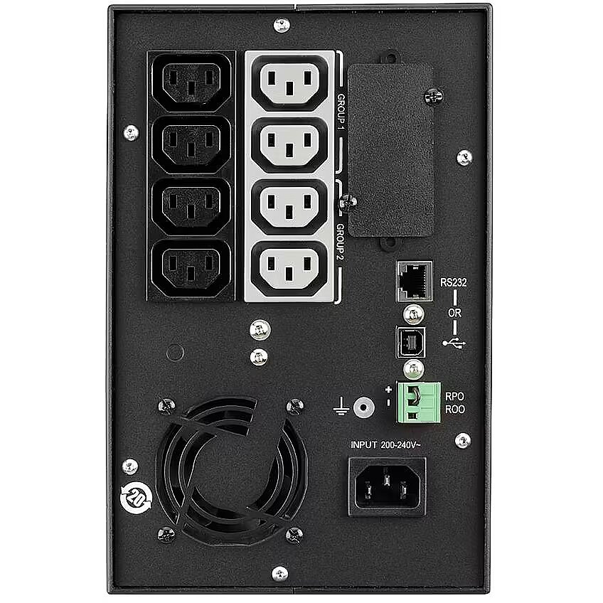 Citas funkcijas - - Izejas spriegums: 200/208/220/230/230/240 V; 50/60 Hz - Divas kontaktligzdu grupas 2 x IEC C13 (10 A) - Automātisks akumulatora tests - 1 mini terminālu bloks attālinātai ieslēgšanai. / Izslēg. un tālvadības avārijas izslēgšanas - 1 kartes slots Komunikācijas tīkls-MS, ModBus-MS, MS-Relay