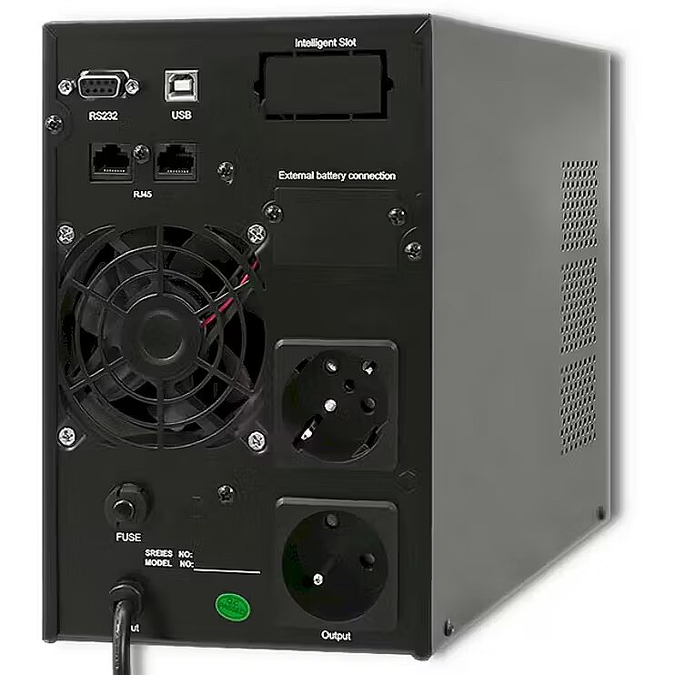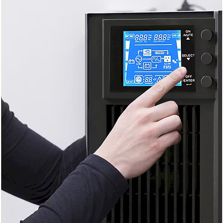 Viegli pārvaldiet savu barošanas avotu pateicoties skaidrajam LCD displejam Integrētais LCD displejs padara ierīces pārvaldību intuitīvu un ērtu. Ekrāns sniedz jums aktuālu informāciju par barošanas bloka darbības statusu un galvenajiem parametriem. Tas nodrošina, ka jūs vienmēr esat informēts par ierīces darbību, ļaujot jums ātri reaģēt uz jebkurām problēmām un optimizēt tās darbību atbilstoši savām vajadzībām. Darbs ar barošanas avotu kļūst vienkāršs, ātrs un uzticams, ļaujot jums koncentrēties uz galvenajiem uzdevumiem, neuztraucoties par strāvas stabilitāti. Jūsu uzticams partneris, lai nodrošinātu jūsu iekārtu nepārtrauktu darbību Tiešsaistes UPS barošanas avots nodrošina pastāvīgi pārveidotu spriegumu. Ja notiek negaidīts tīkla sprieguma kritums, barošanas avots nodrošina pievienotās ierīces darbību, pateicoties iebūvētajām baterijām, kas tiek pastāvīgi uzlādētas. Tāpēc elektrotīkla strāva ir nepieciešama tikai bateriju uzlādēšanai. Ierīces, kas ir pastāvīgi pieslēgtas barošanas avotam, vienmēr saņem tīru, nepārtrauktu strāvu no baterijas, tāpēc tiešsaistes UPS izejas spriegums vienmēr paliks nemainīgs, neatkarīgi no ieejas sprieguma. Ierīču rezerves laiks, atkarībā no slodzes, ir no dažām līdz vairākiem desmitiem minūtēm. Tas ir laiks, kas nepieciešams, lai saglabātu datus un droši izslēgtu iekārtu.