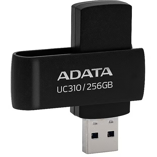 LongSummaryDescription - ADATA UC310. Capacity: 256 GB, Device interface: USB Type-A, USB version: 3.2 Gen 1 (3.1 Gen 1), Read speed: 100 MB/s. Form factor: Swivel. Weight: 9 g. Product colour: Black