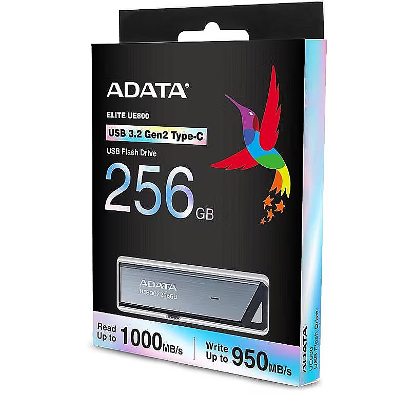 LongSummaryDescription - ADATA UE800. Capacity: 256 GB, Device interface: USB Type-C, USB version: 3.2 Gen 2 (3.1 Gen 2), Read speed: 1000 MB/s, Write speed: 950 MB/s. Form factor: Slide. Weight: 13 g. Product colour: Silver