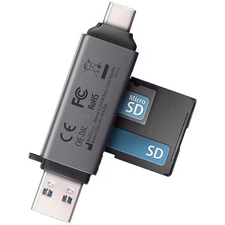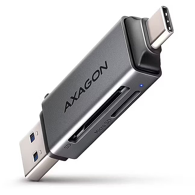 LongDesc - Mobile Mini Memory Card Reader AXAGON CRE-DAC with USB 5 Gbps interface supports all current versions of SD and microSD cards including SDXC and microSDXC with capacities up to 2TB. The big advantage of the reader is both the USB-C and the USB-A connector, so the connection is really universal. The reader can be directly connected to all desktop computers or laptops, as well as to phones and tablets with a USB-C connector.With USB 3.2 Gen 1 (USB 3.0) interface, the reader achieves significantly higher data rates for UHS-I SD cards compared to USB 2.0 interface readers. The card reader allows simultaneous handling of cards in both slots and direct copying between them.The metal body of the reader not only looks great, but also increases its durability. The finely structured surface with no fingerprint remains will also please you. Both connectors are protected by carrying caps when carrying them. The included hinge allows the card reader to be attached to a key ring. Installation is easy for everyone, just plug the reader into the USB port of your computer or mobile phone and the rest is done automatically. Card reader - two slots, supports the following formats:• Micro SD slot: microSD / microSDHC / microSDXC / TransFlash,• SD slot: Secure Digital, SDHC, SDXC, MultiMedia Card, MMC 4.0, MMC Dual Voltage, MMC mobile, RS-MMC, with miniSD, microSD, microSDHC, microSDXC, MMC Micro adapter.The reader supports the following flash card specifications:• SD 1.0/1.1 (SD - Secure Digital, up to 2GB).• SD 2.0 (SDHC - Secure Digital High Capacity, up to 32GB).• SD 3.0 (SDXC - Secure Digital eXtended Capacity, up to 2TB).• MMC and eMMC 3.x/4.0/4.1/4.2/4.3/4.4/4.5/5.0 (8-bit).• Supports SD 3.01 and SD Jukebox applications (CPRM functions).• Supports Ultra High Speed bus UHS-I (SDR12/SDR25/SDR50/DDR50/SDR104) speeds up to 104 MB/s.• Supports hardware ECC (Error Correction Code) function and CRC (Cyclic Redundancy Check) function.• 2 LUN - the reader is indicated as two disk drives in the file manager.• FAT 12/16/32, NTFS, exFAT (FAT 64) file formats support.Other features:• SuperSpeed USB - USB 3.2 Gen 1 interface (before USB 3.1 Gen 1 / USB 3.0).• Also compatible with USB 3.2 Gen 2, backward compatible with USB 2.0 and USB 1.1.• Supports transmission rates 1.5 / 12 / 480 / 5000 Mbit/s (low / full / high / super speed). • Full Plug and Play and Hot Swap support.• Connects via USB type C male or A male connector.• Support for connection of phones with microUSB connector via OTG adapter.• Reader power via USB bus (bus-power).• The LED indicates the connection of the reader to the computer.• Dimensions 70 x 17 x 10 mm with caps attached.• Weight 14 g.Supported OS:• MS Windows 7 / 8 / 8.1 / 10 / 11 and later, Windows Server 2008 / 2012 / 2016 / 2019 / 2022 and later (all 32- and 64-bit Windows versions supported), Mac OS X 10.x and higher Linux with 2.4.x kernel and higher, Android all versions.• Note: Drivers are included with supported operating systems and are installed completely automatically. No other drivers need to be installed and are not even available.Package contains:• SuperSpeed USB card reader,• 2 USB connector caps,• key hinge,• multilingual guide CZ / DE / DK / ENG / ESP / FIN / FR / GR / HR / HU / IT / NL / PL / PT / RO / RU / SK / SWE / TR / BG / CN / ARA,• packed in a cardboard box with a hanging hole.