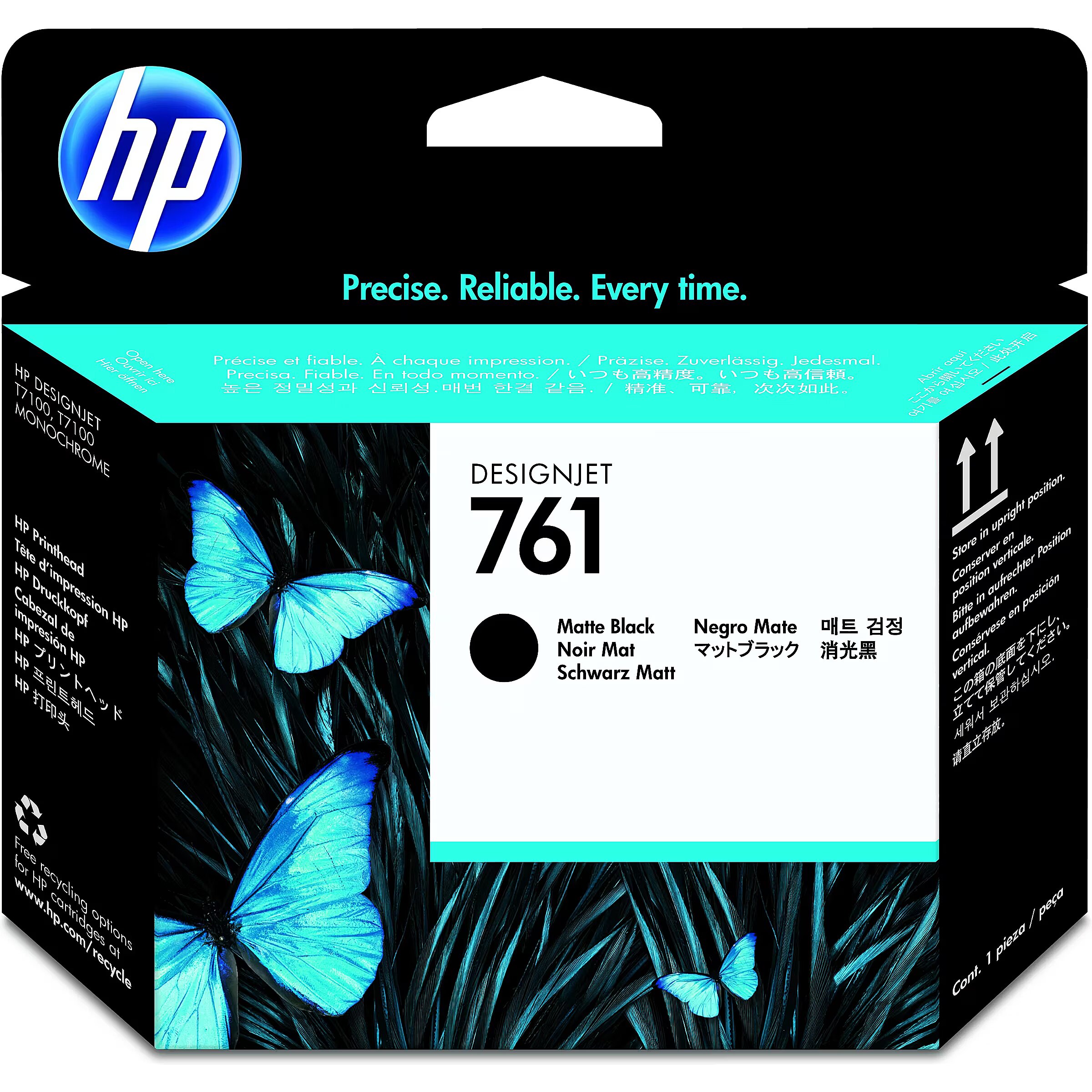 LongSummaryDescription - HP 761 Matte Black/Matte Black Designjet Printhead. Compatibility: HP DesignJet T7100 Printer, Print technology: Inkjet, Printing colours: Matte black. Width: 28 mm, Depth: 143 mm, Height: 132 mm. Package dimensions (WxDxH): 28 x 143 x 132 mm, Package width: 280 mm, Package depth: 1430 mm. Master (outer) cases per pallet: 80 pc(s), Products per pallet: 1920 pc(s), Layers per pallet: 10 pc(s). Quantity per box: 1 pc(s)
